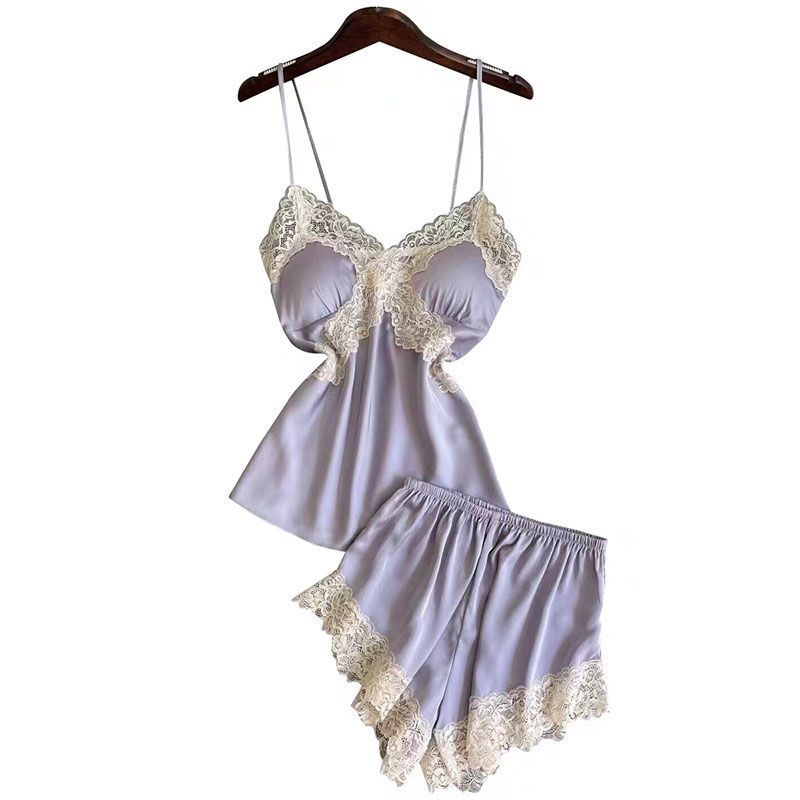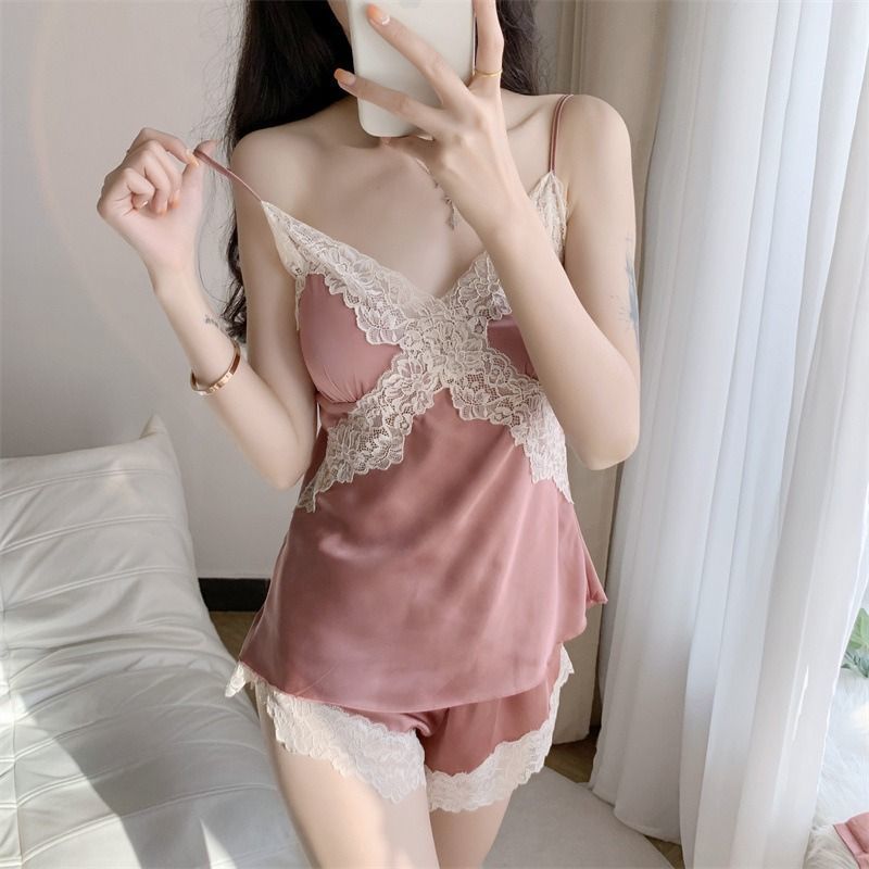【Readay Stock】性感睡衣女带胸垫春夏季冰丝两件套装背心吊带短裤家居服2023新款Sexy Pajamas Women with Chest Pad Spring and Summer Ice Silk Two Pieces