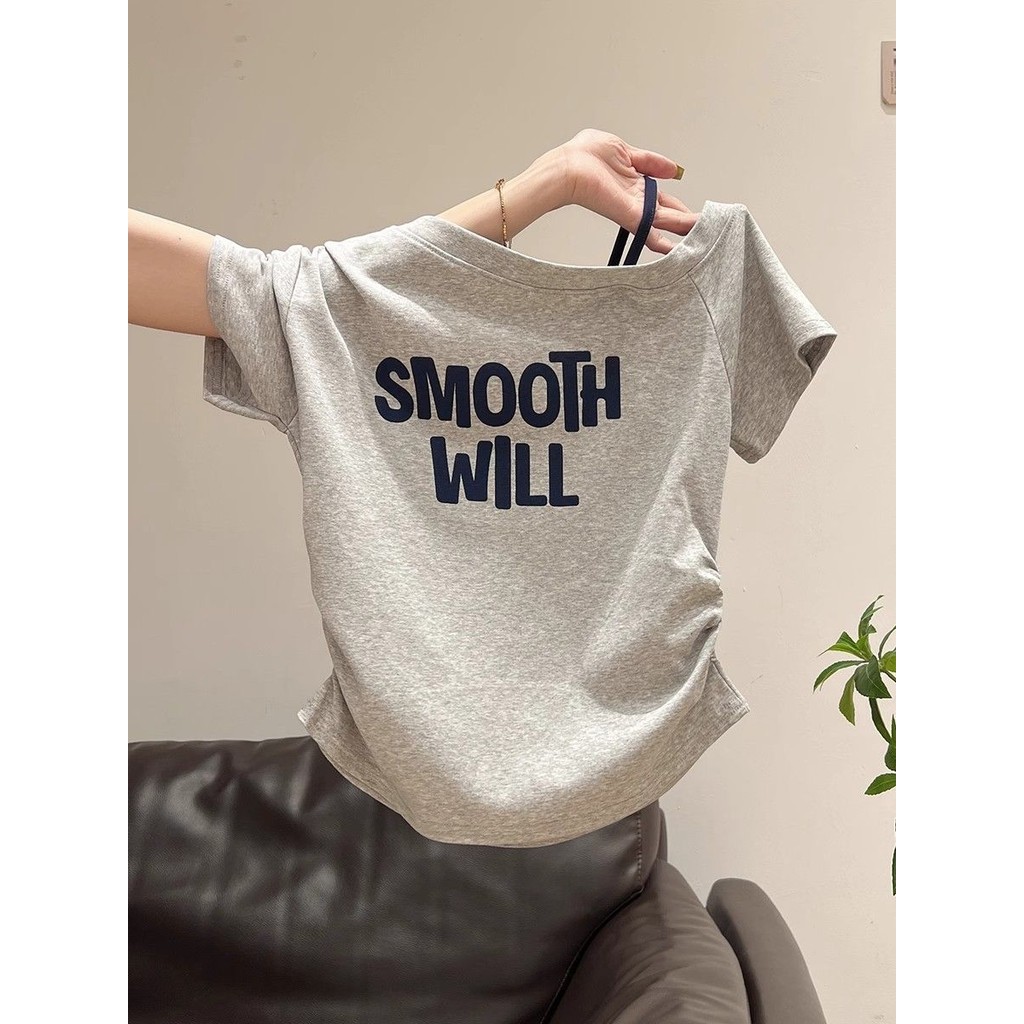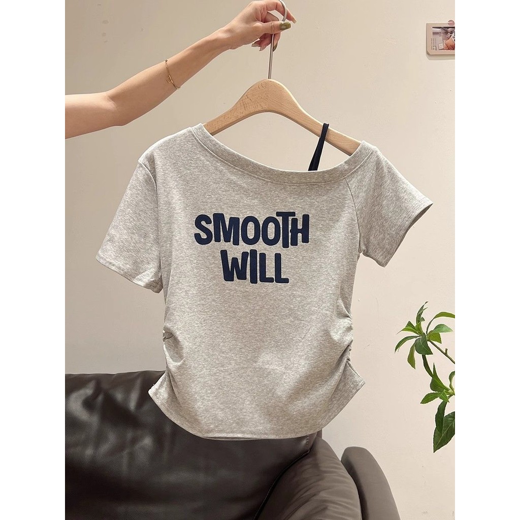 【Readay Stock】灰色字母印花收腰褶皱短袖t恤女2025夏季新款斜肩吊带高级感上衣Women's Grey Letter Printed Waisted Pleated Short-sleeved T-shirt