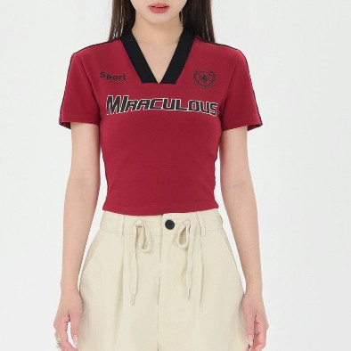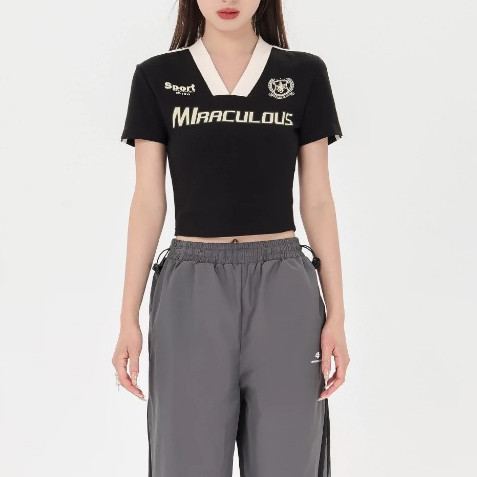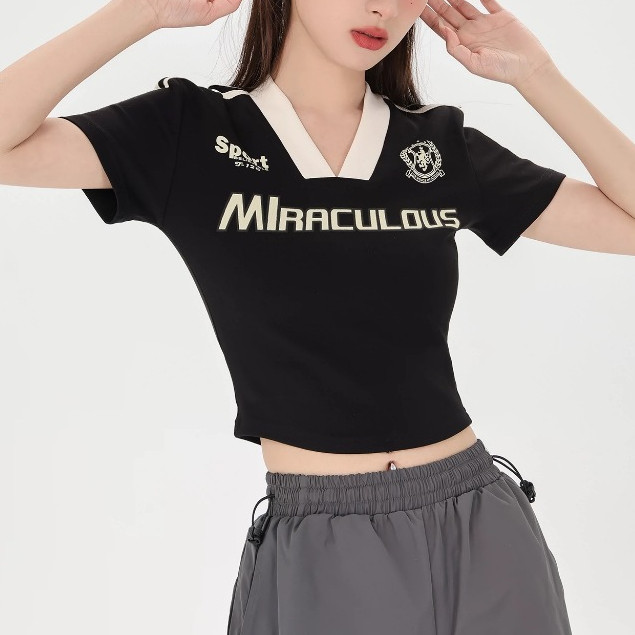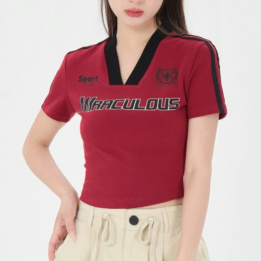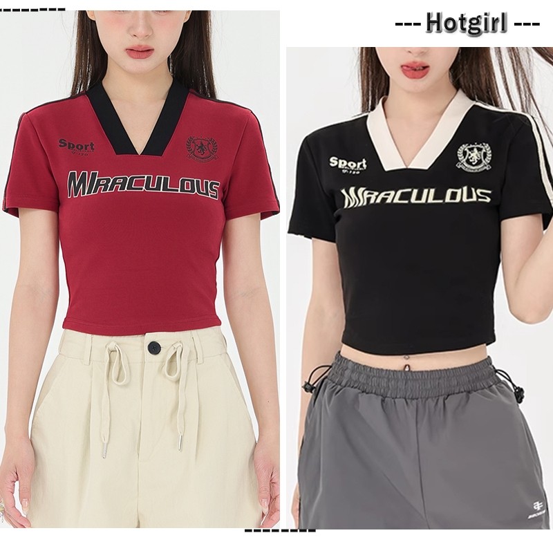 【READY STOCK AT Johor】 Hotgirl⭐Spicy Girl Top Women's Summer American Style Retro Contrast Letter V-neck T-shirt