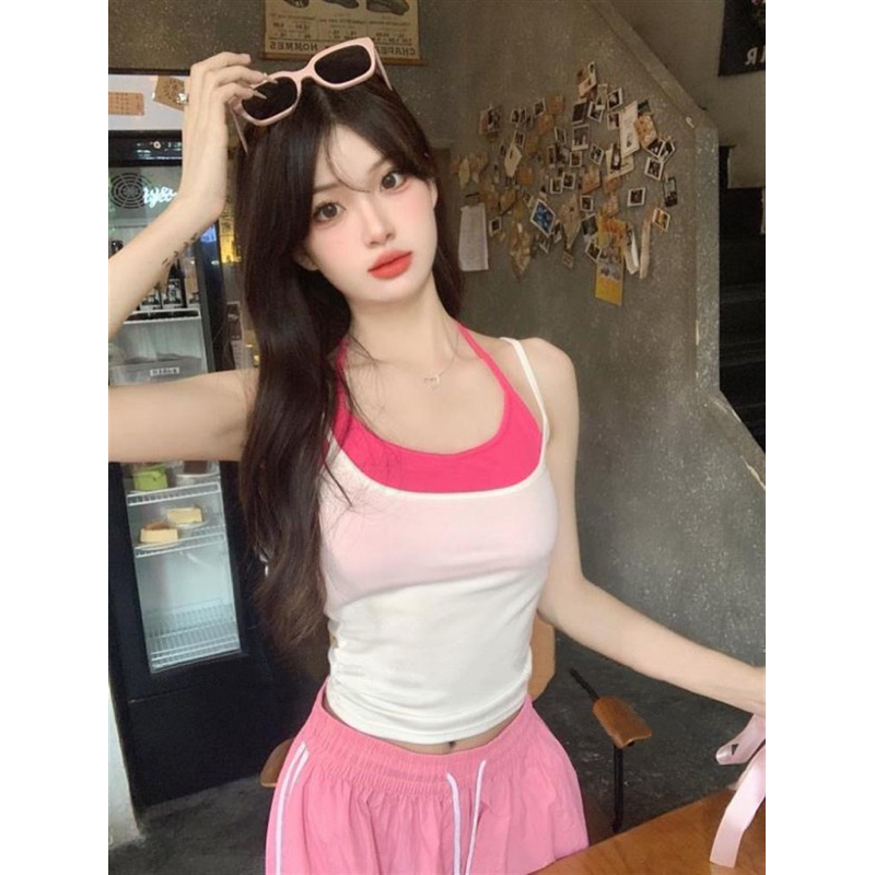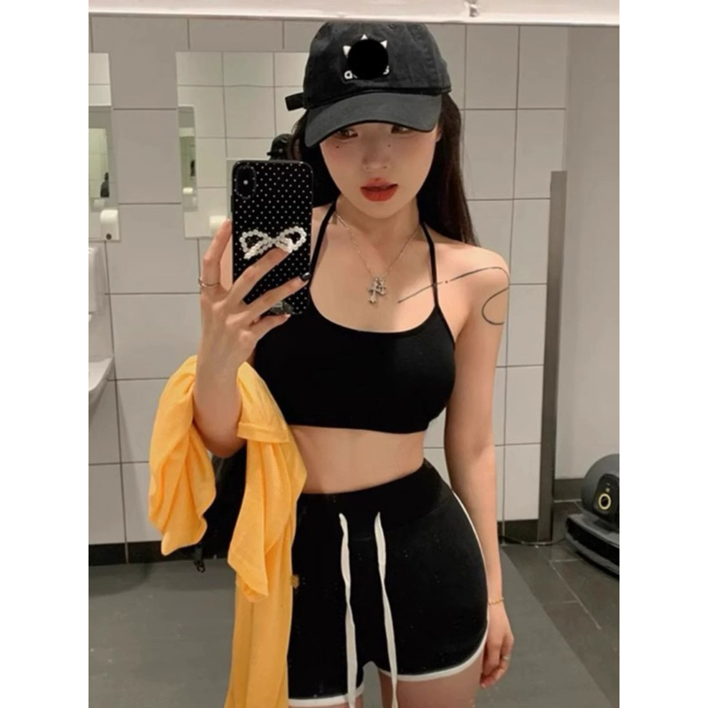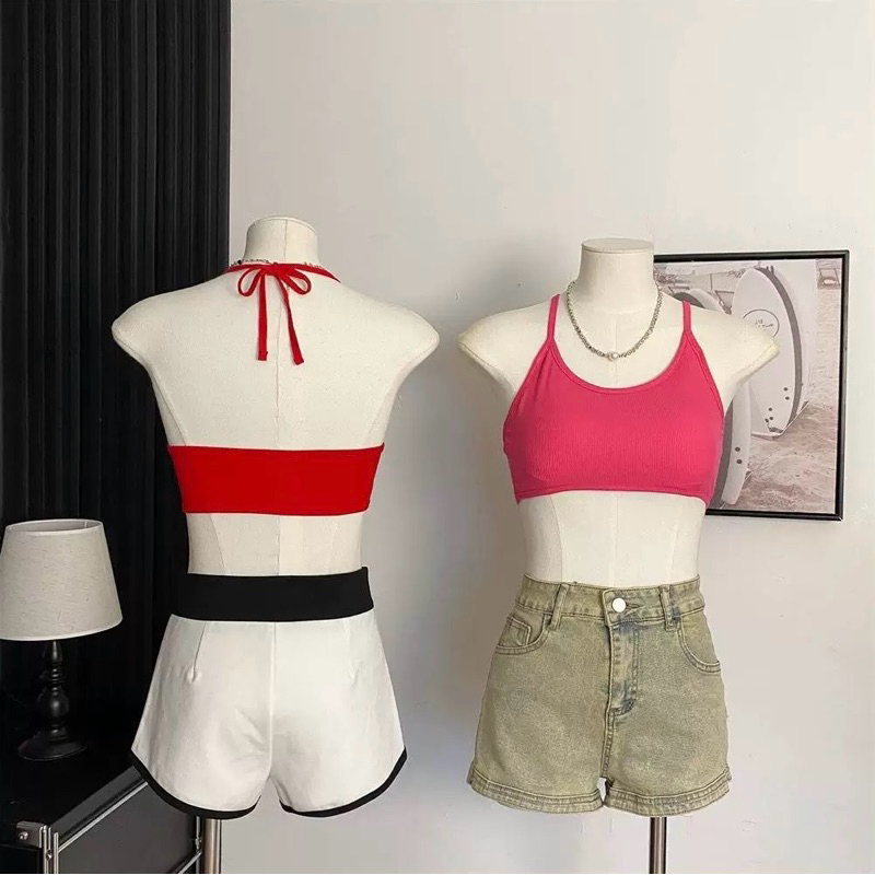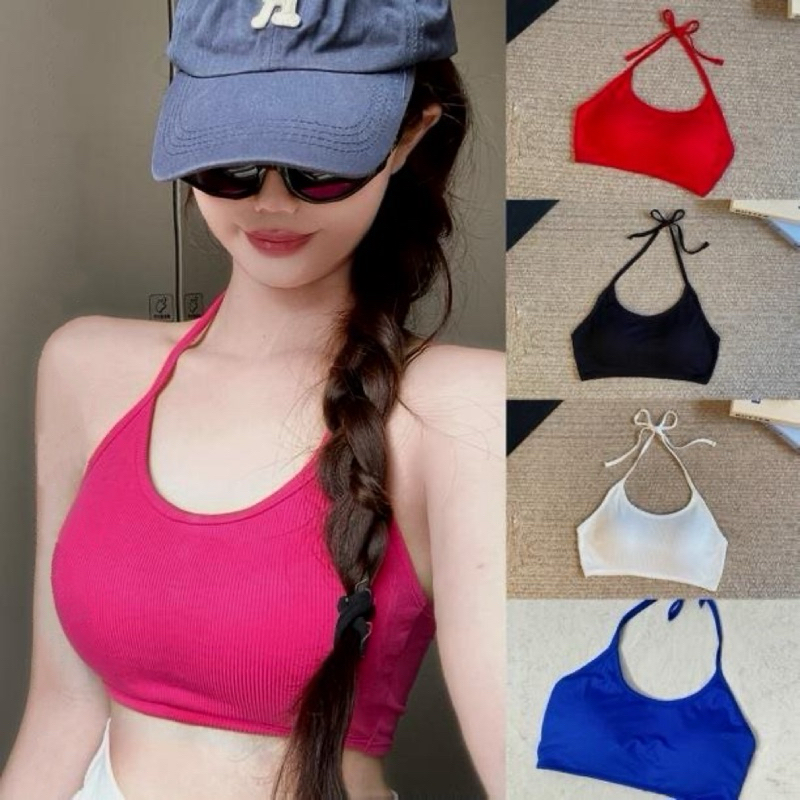 【Ready Stock】Beach vacation with breast pads and sexy backless halterneck camisole summer short outer top with laces