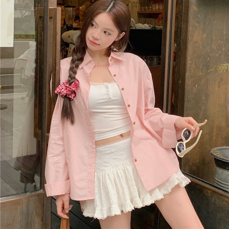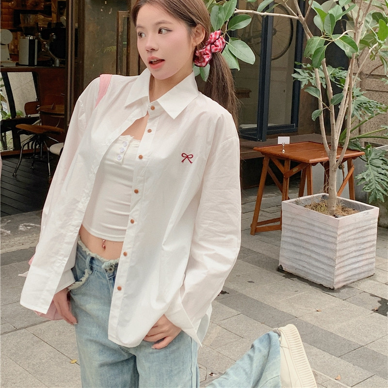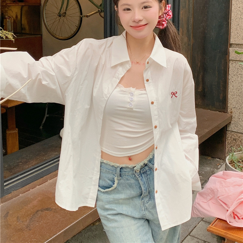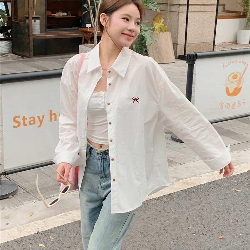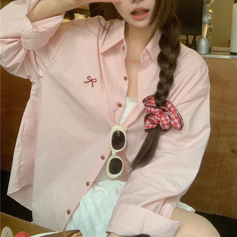✨【READY STOCK】Bella Women's Solid Color Korean Style Blouse With Butterfly Pattern Long Sleeve Fold-Over Collar Tops