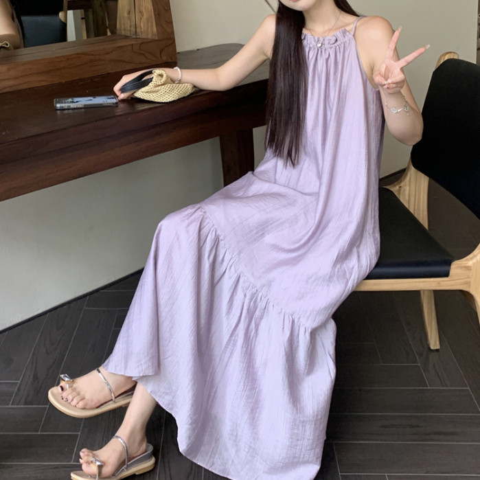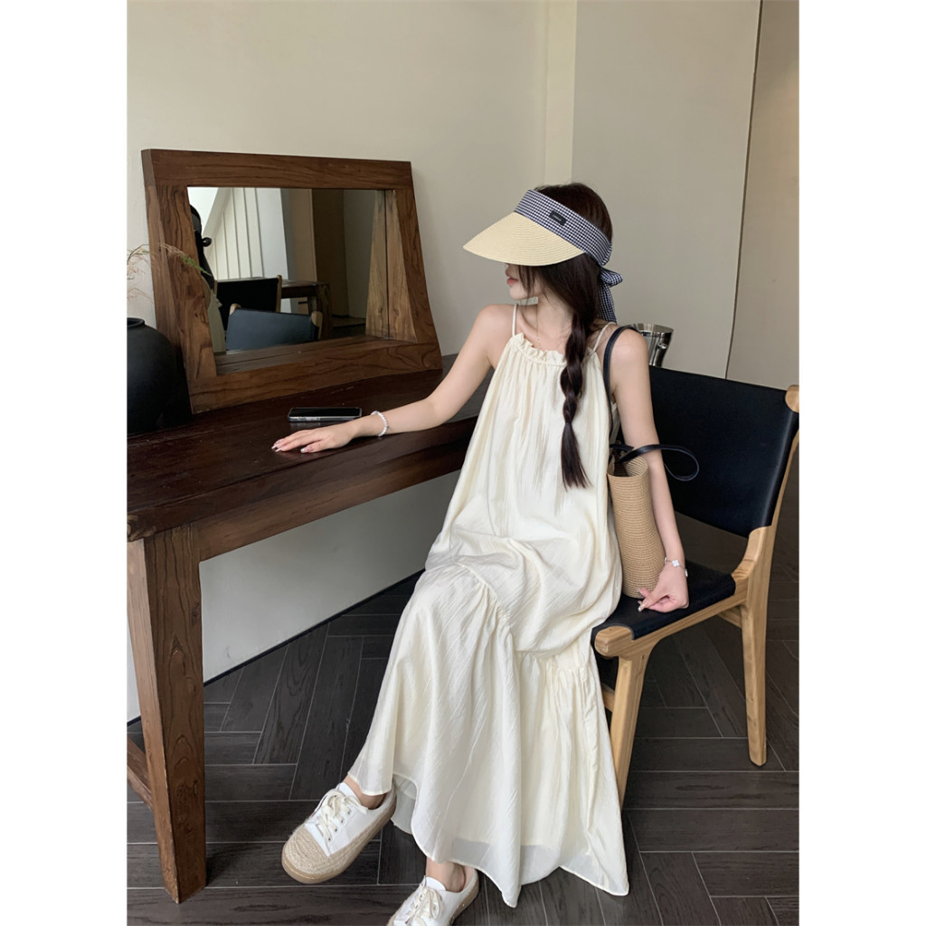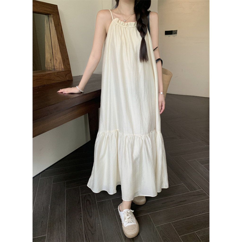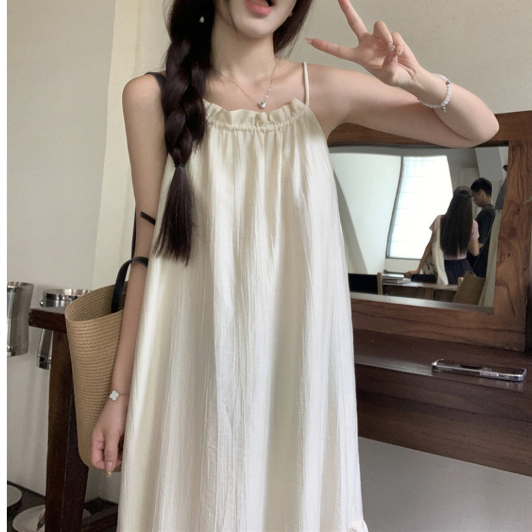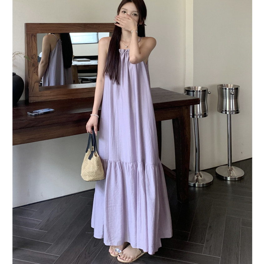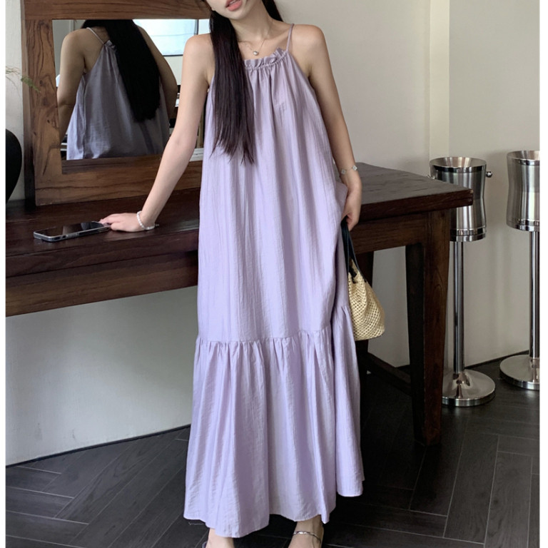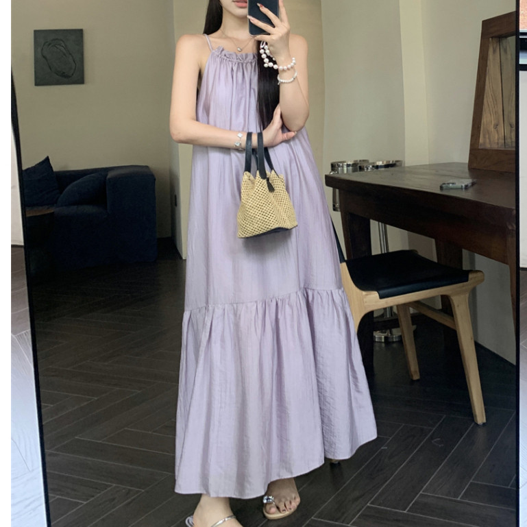 【READY STOCK】 CherryShop⭐Suspender dress loose pleated solid color long dress beach dress