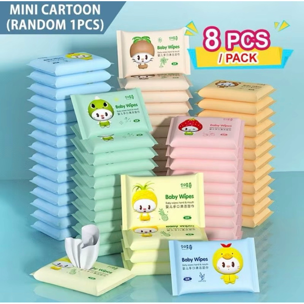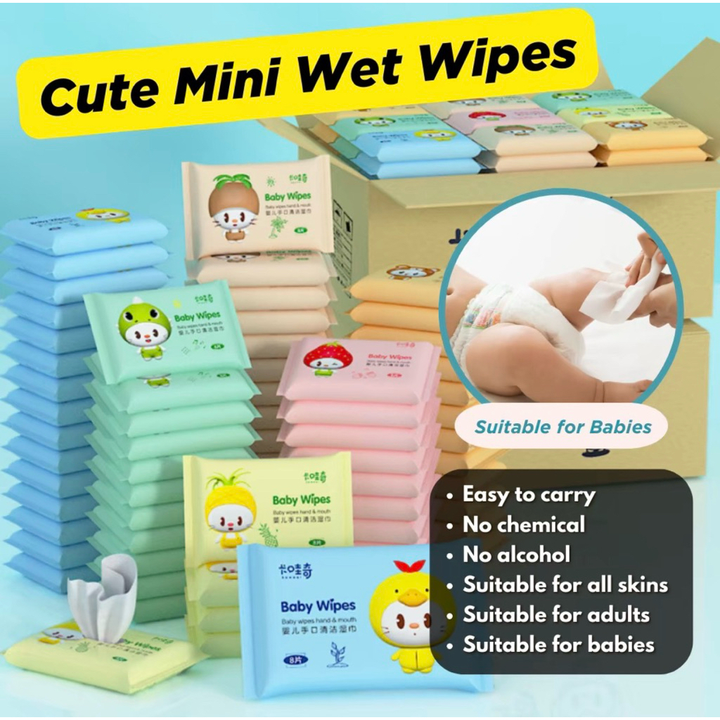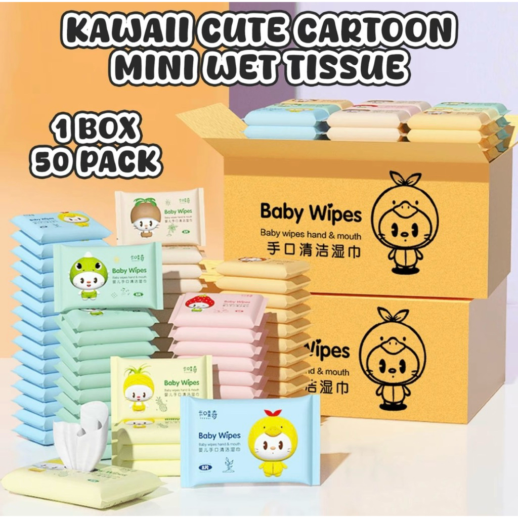 【Ready Stock】Cute Mini Wet Tissue Bundle Pack 可爱迷你湿纸巾– 50pcs Random Cartoon Design | Kawaii Small Wipes Travel Pack