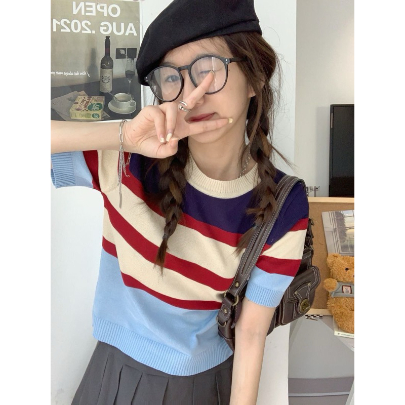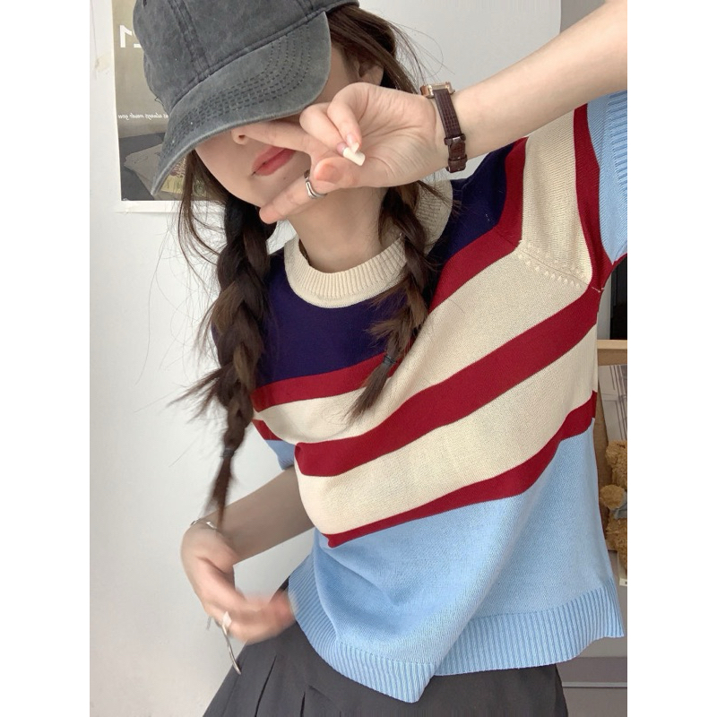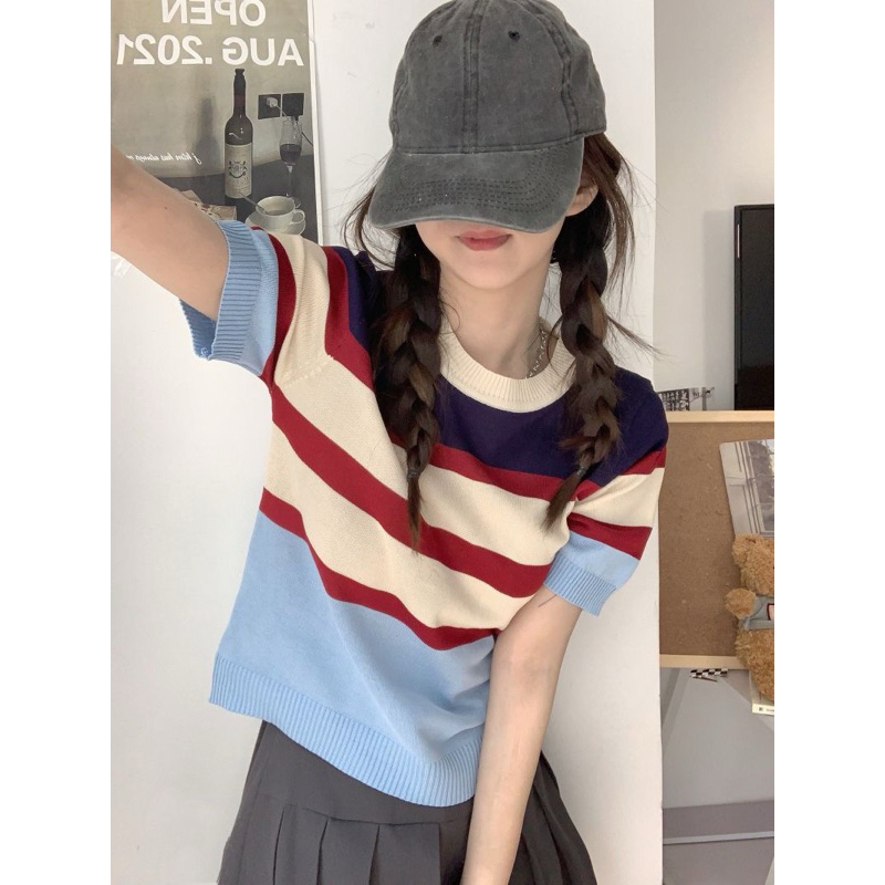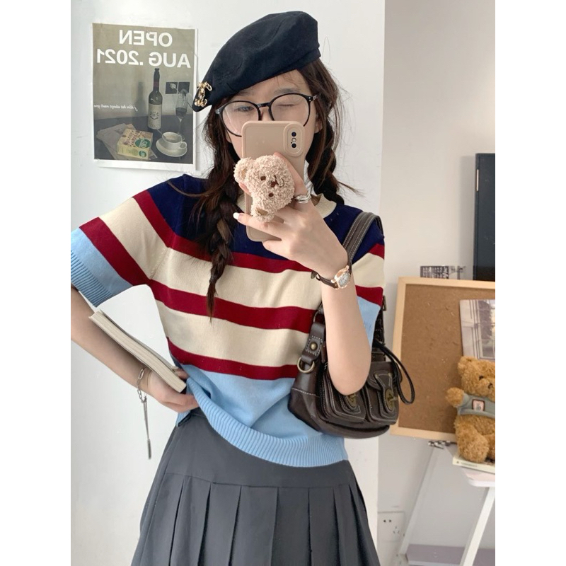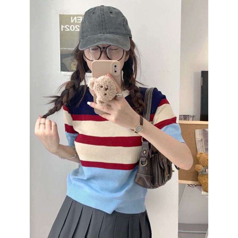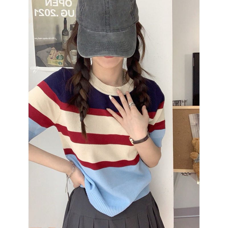 (READY STOCK IN MALAYSIA) Eliza Striped Round Neck Short Sleeve Knitted Top T-shirt 休闲拼色条纹圆领短袖针织上衣T恤