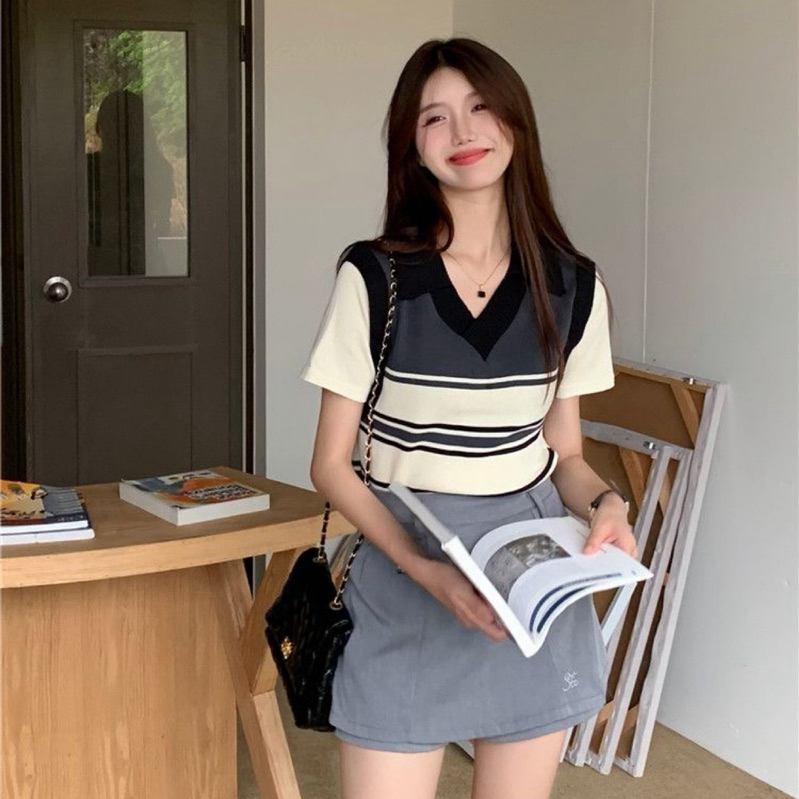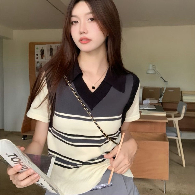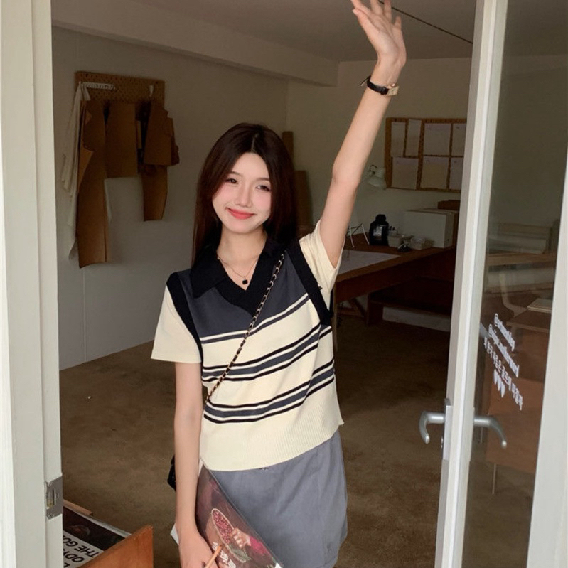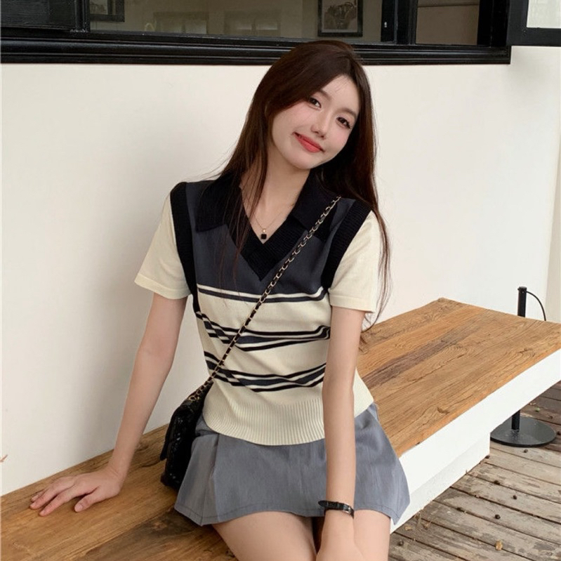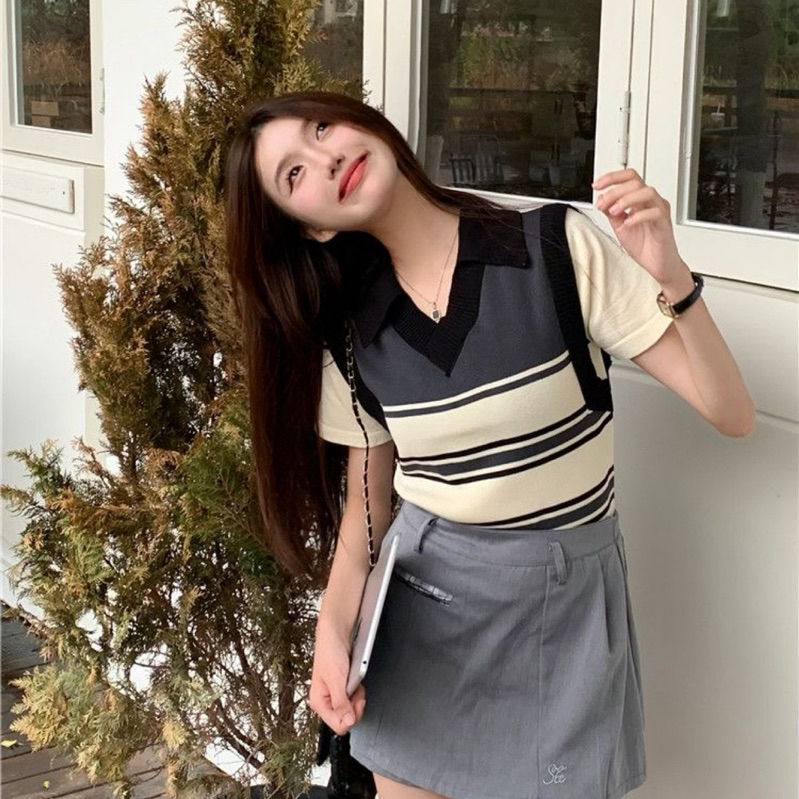 (READY STOCK IN MALAYSIA) Selena Striped Short Sleeve Knitted Top T-shirt 百搭条纹撞色假两件短袖宽松针织上衣T恤