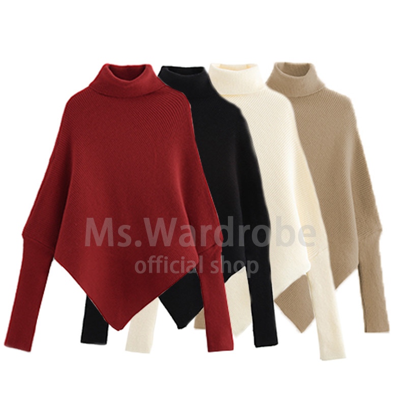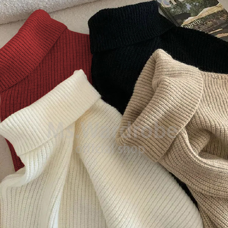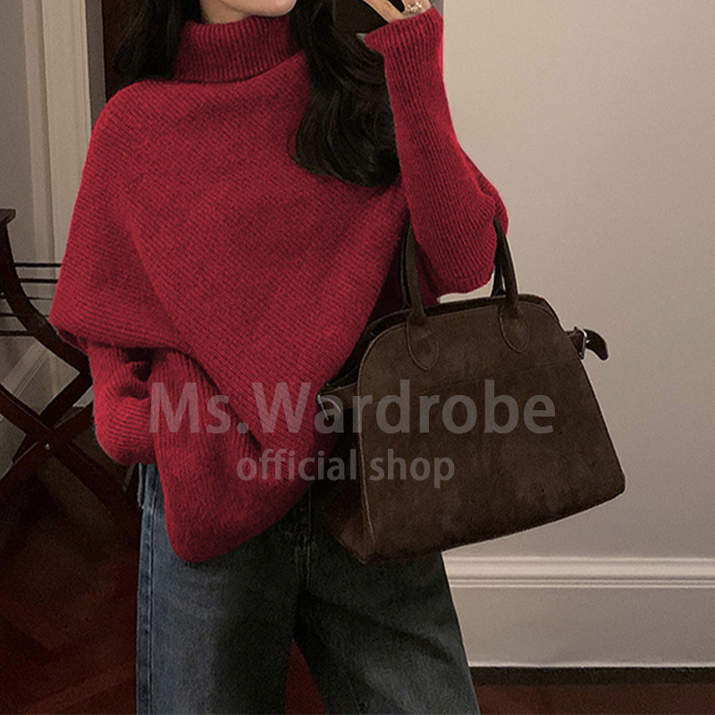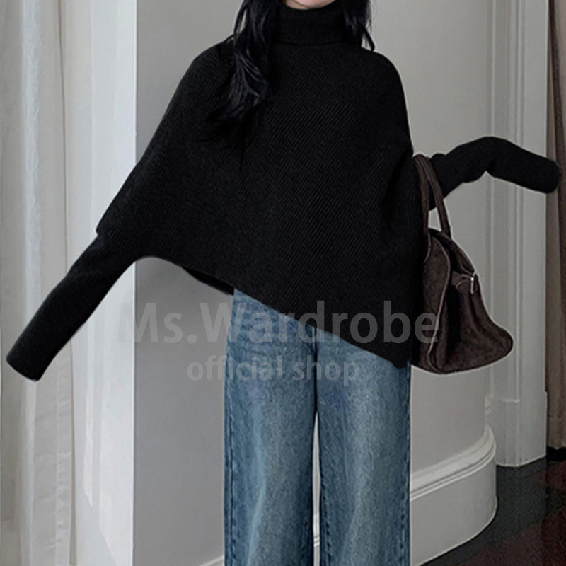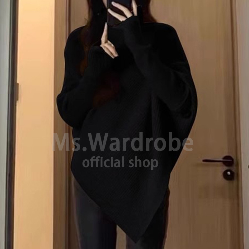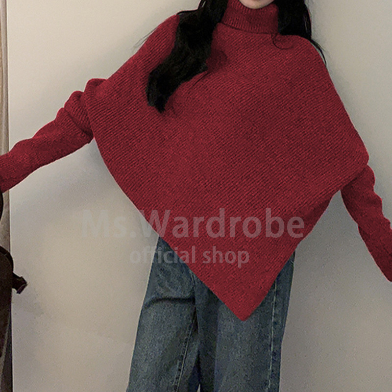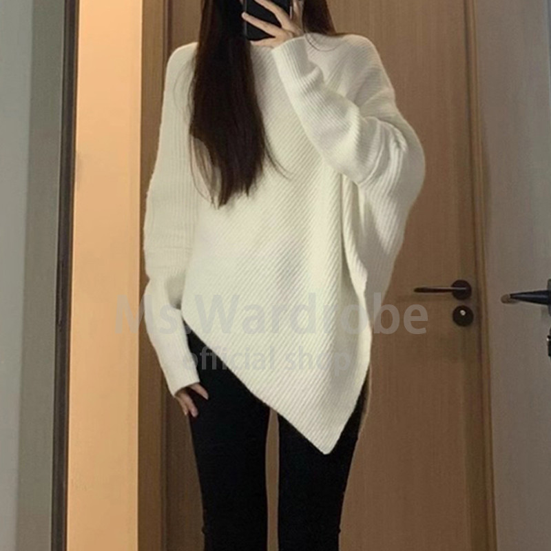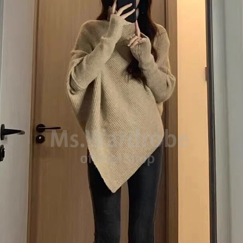 Ready Stock Korean Irregular High Neck Knit Sweater Women Long Sleeve Casual Pullover Baju Sejuk Wanita Harian