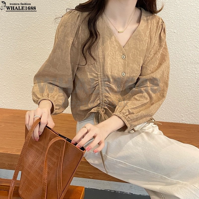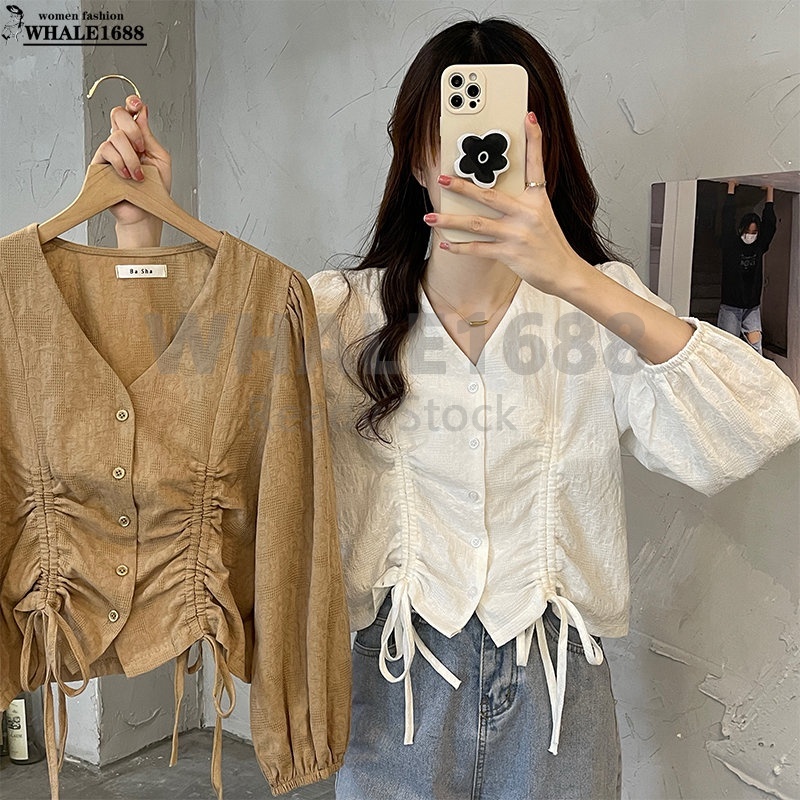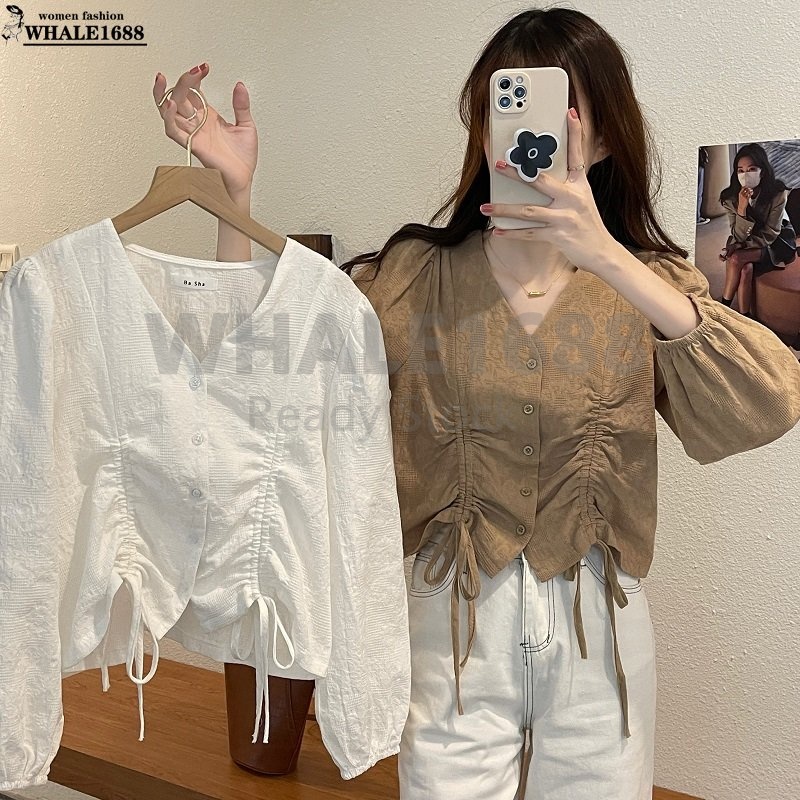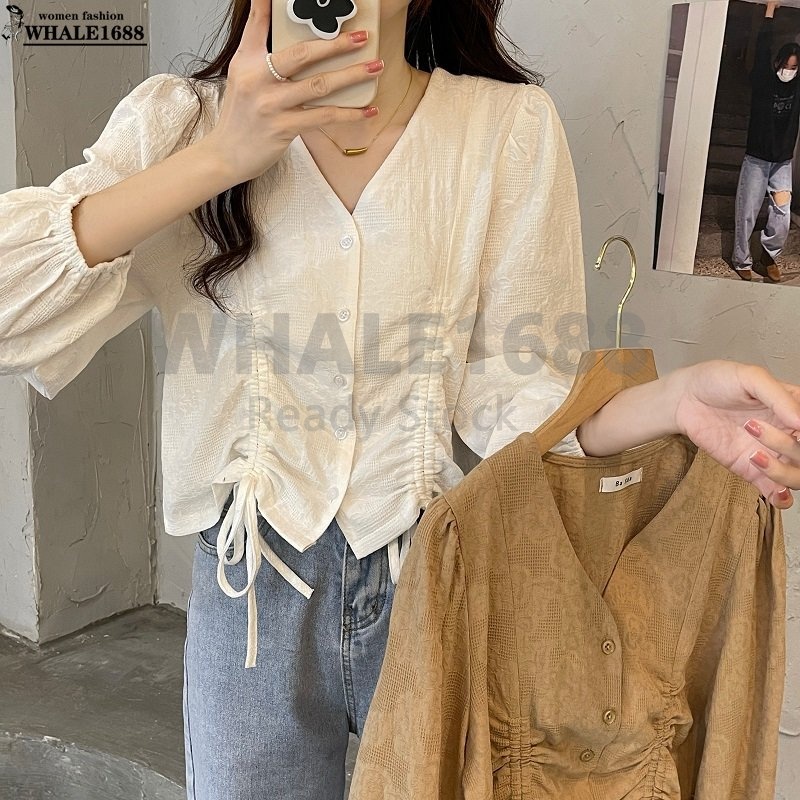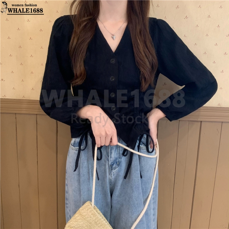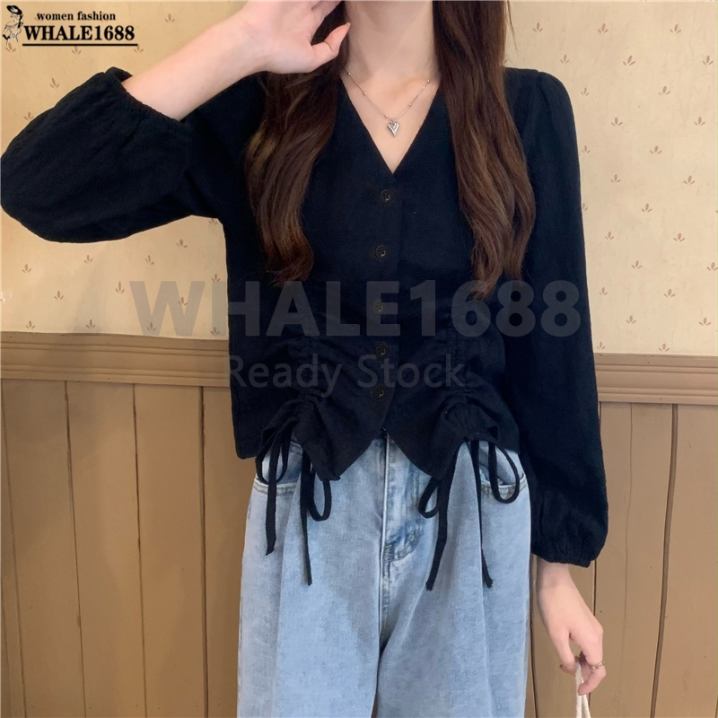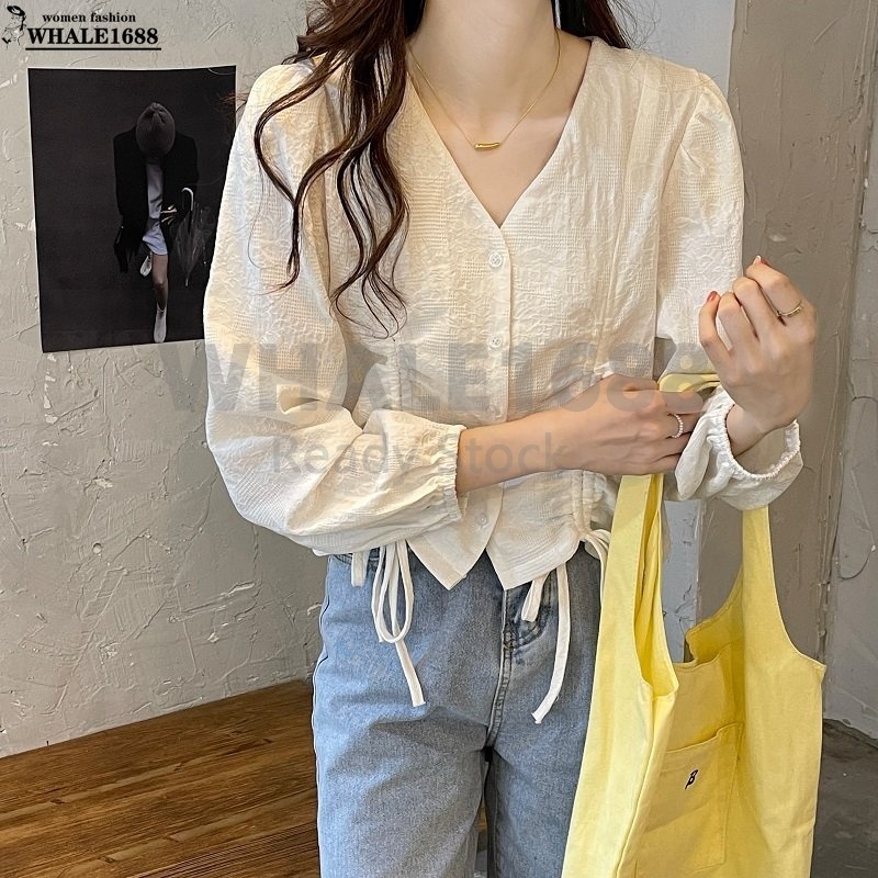 【Ready Stock】Korean Style Women Ladies Loose V Neck Drawstring Long Sleeve Shirt Blouse Baju Baju Wanita Lengan Panjang