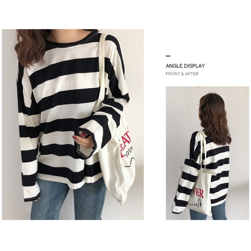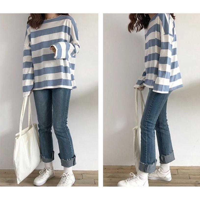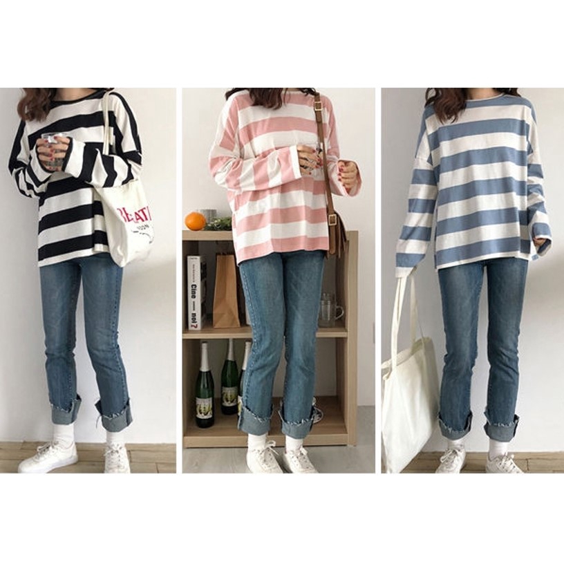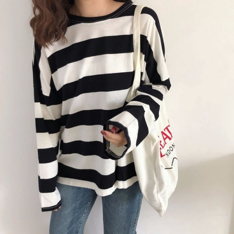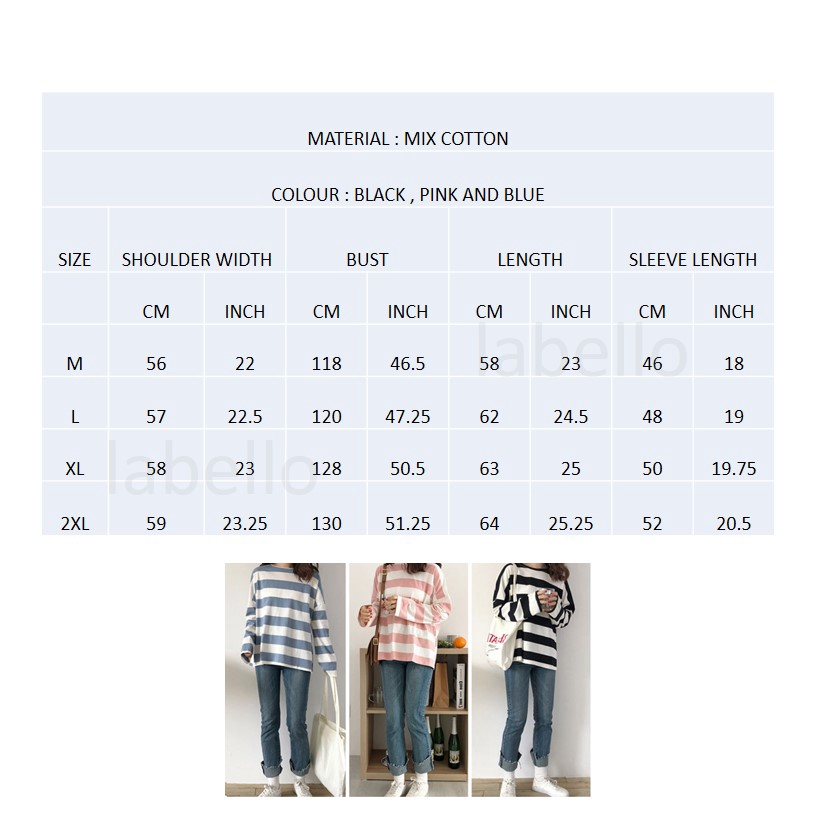 [READY STOCK] M - 2XL PLUS SIZE Korea Loose Stripe Shirt Long Sleeve Top T-shirt Baju Jalur Baju Viral Lengan Panjang