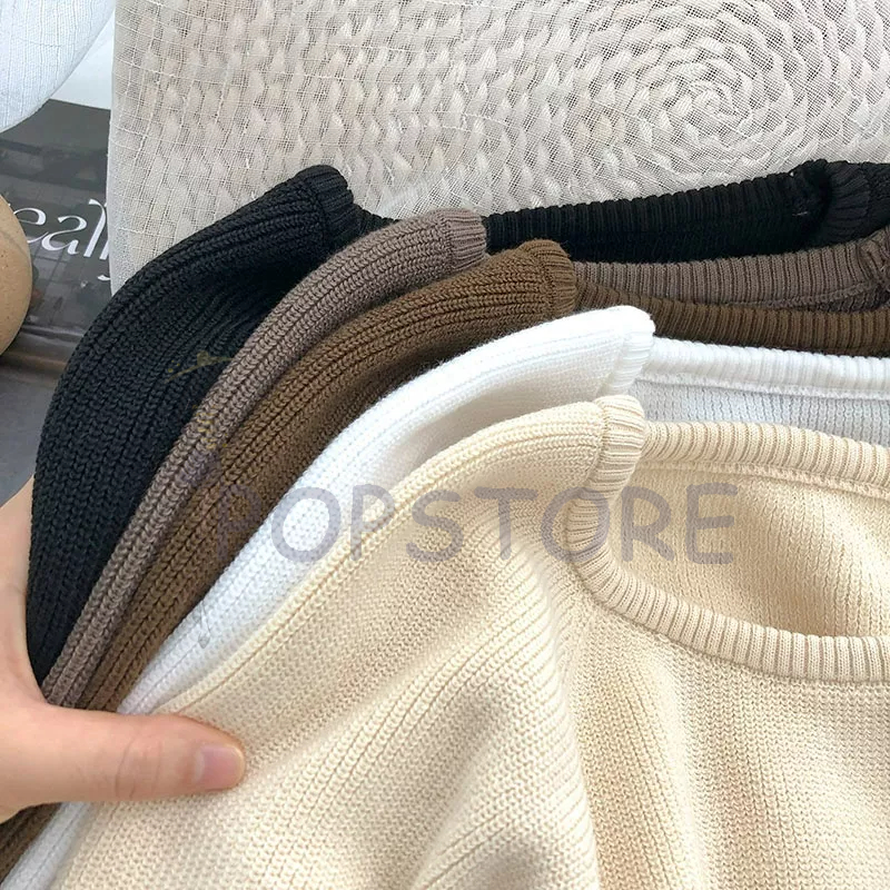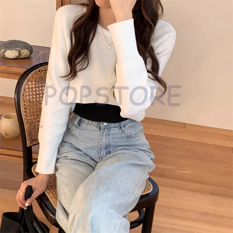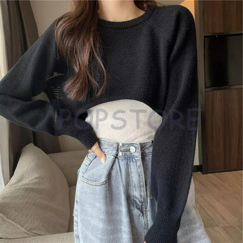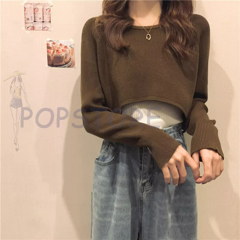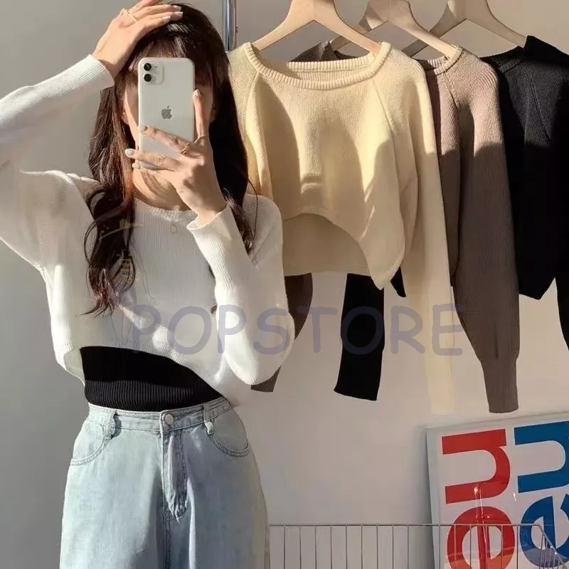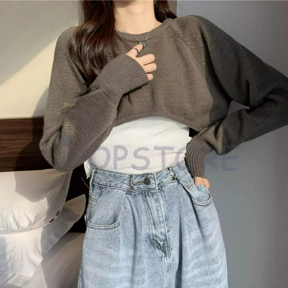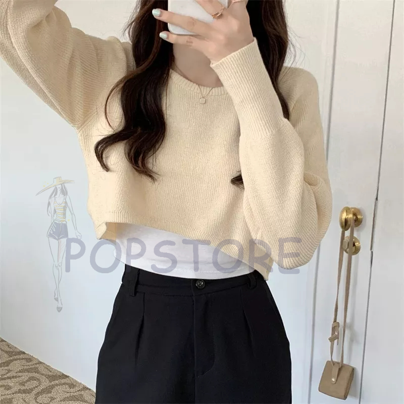 ?Ready Stock?New Sweater Wanita baju Knitted Crop Tops Korean Style Women Plain Round Neck Long Sleeve Loose Knitwear
