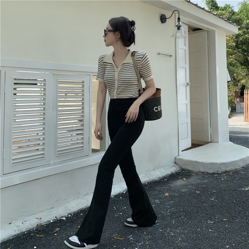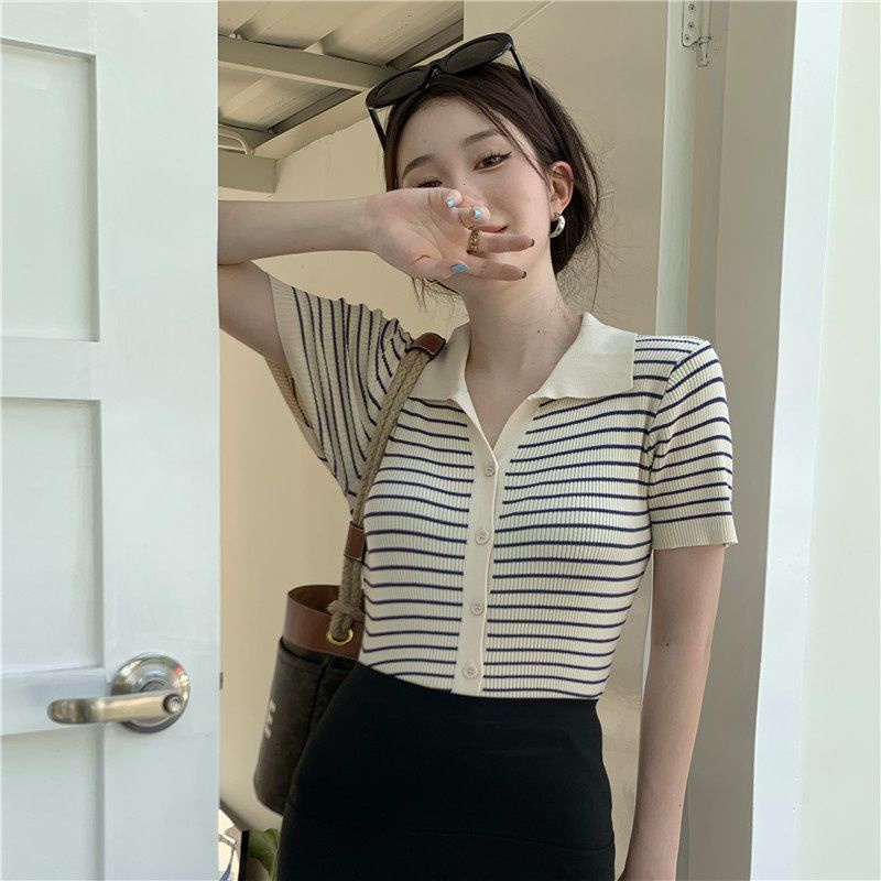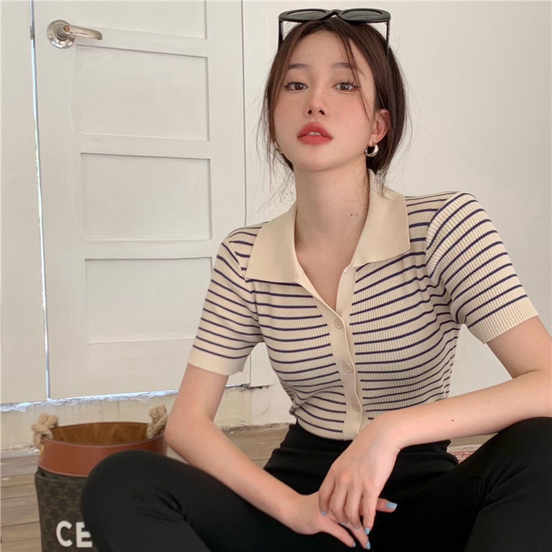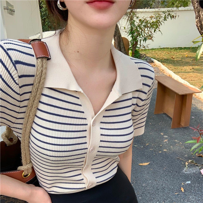 [Ready Stock] Striped Polo Neck Knitwear Short Top Summer Women Korean Style Short Sleeve Apricot T-shirts