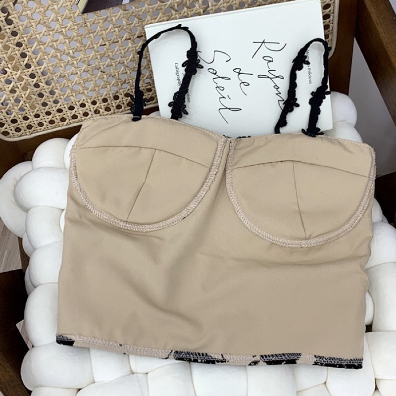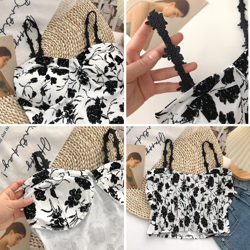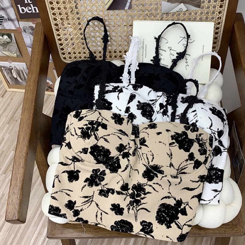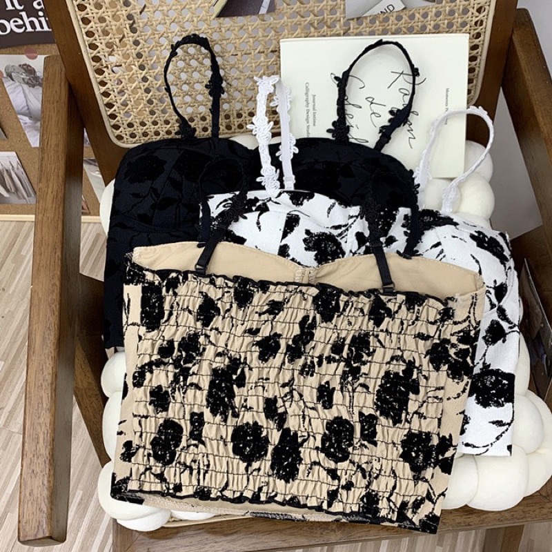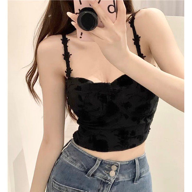 【Ready Stock】Velvet rose print design sling top women with chest pad outerwear vest sleeveless slimming bottoming shirt
