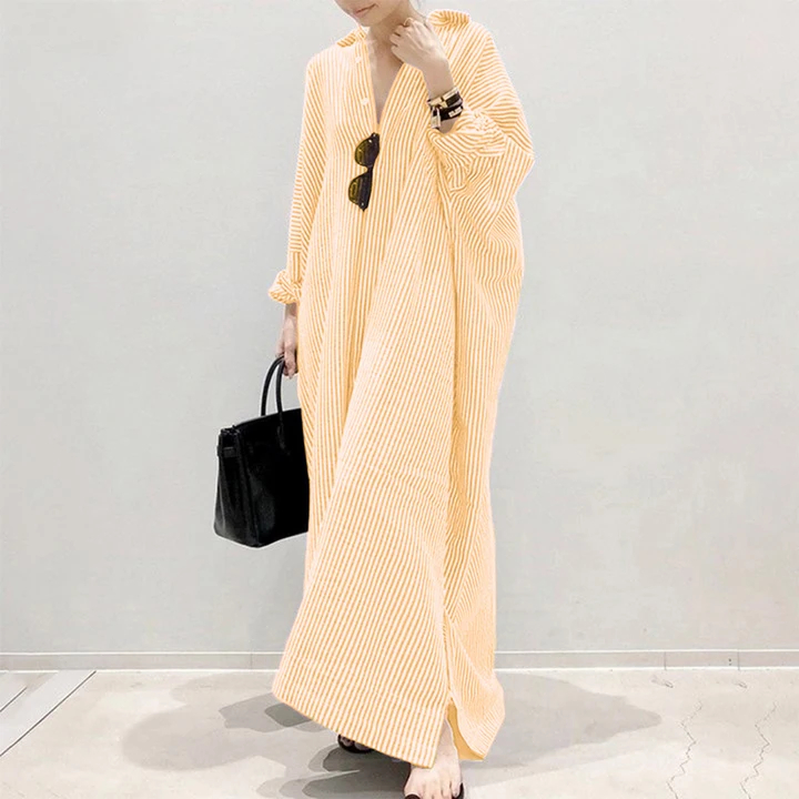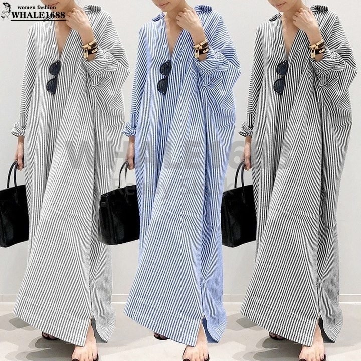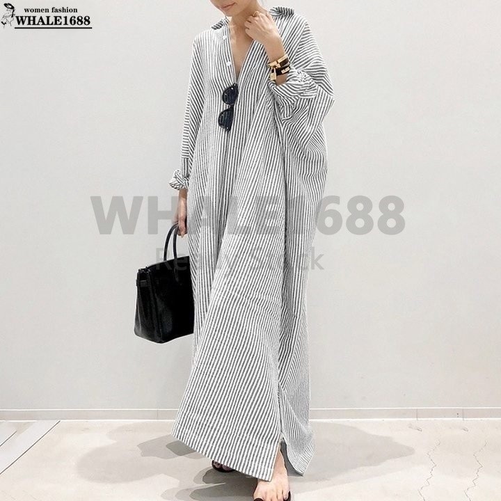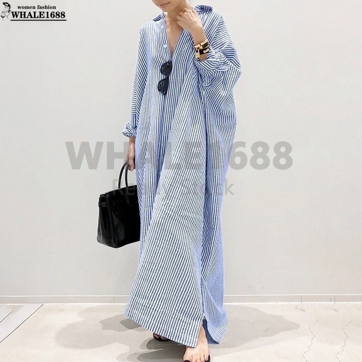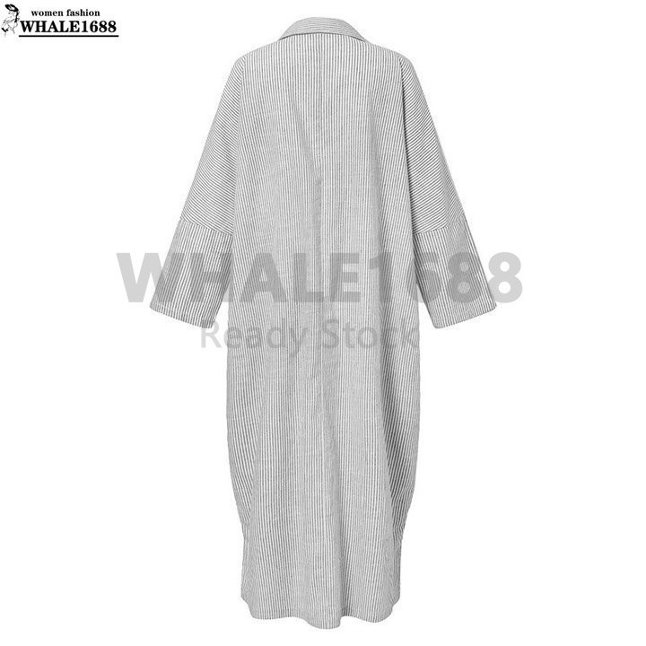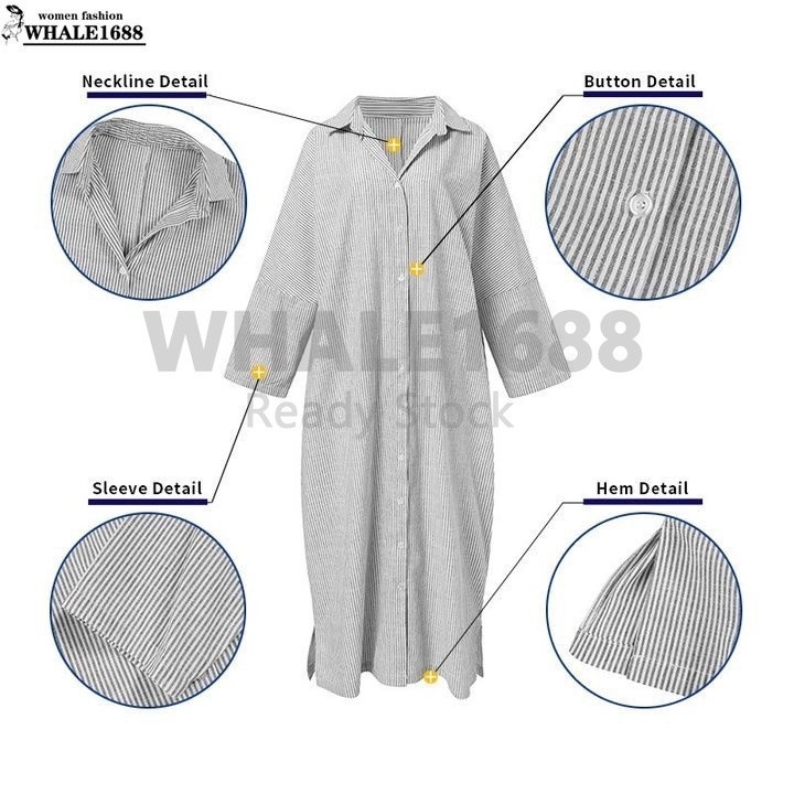 【Ready Stock 】Women Fashion Casual Stripe Printed Button Down Split Hem Maxi Shirt Dress