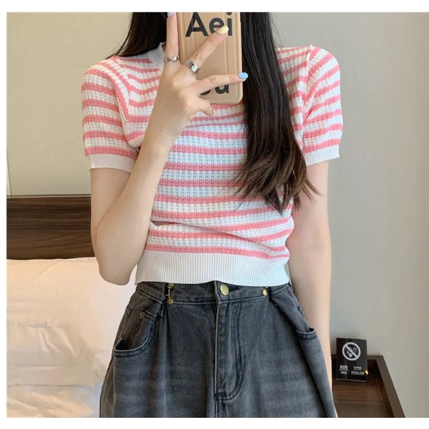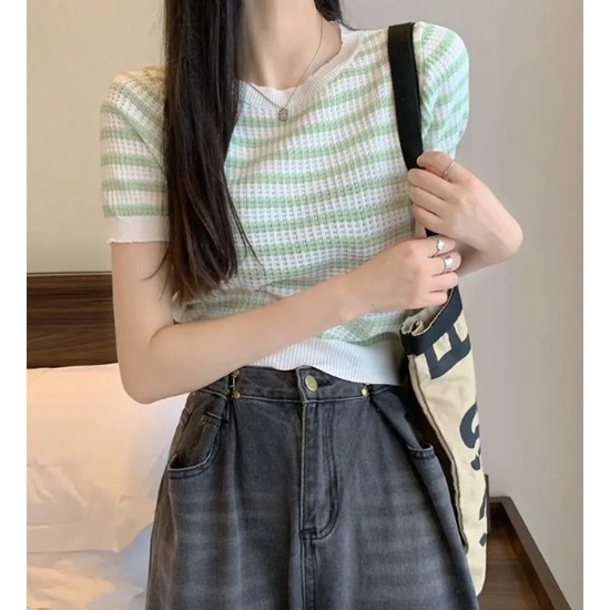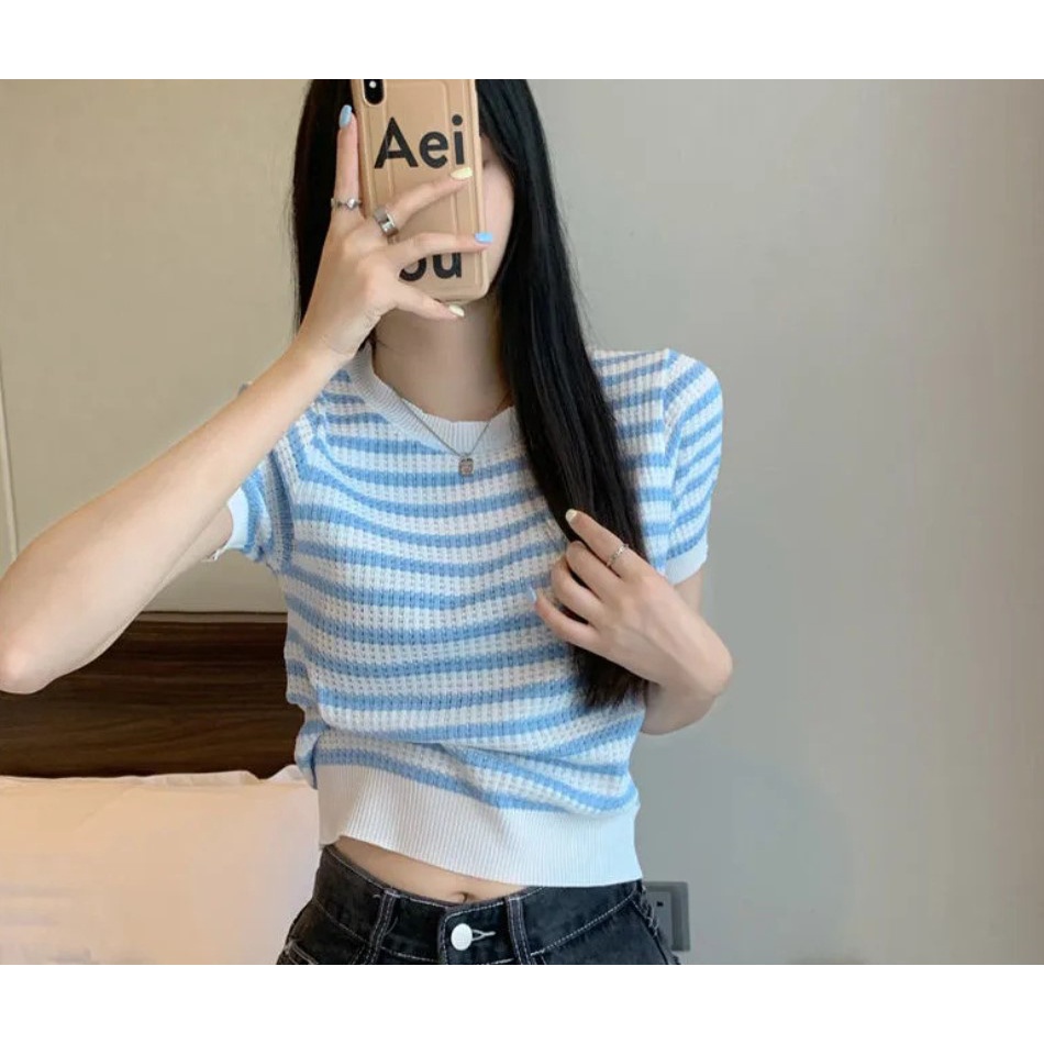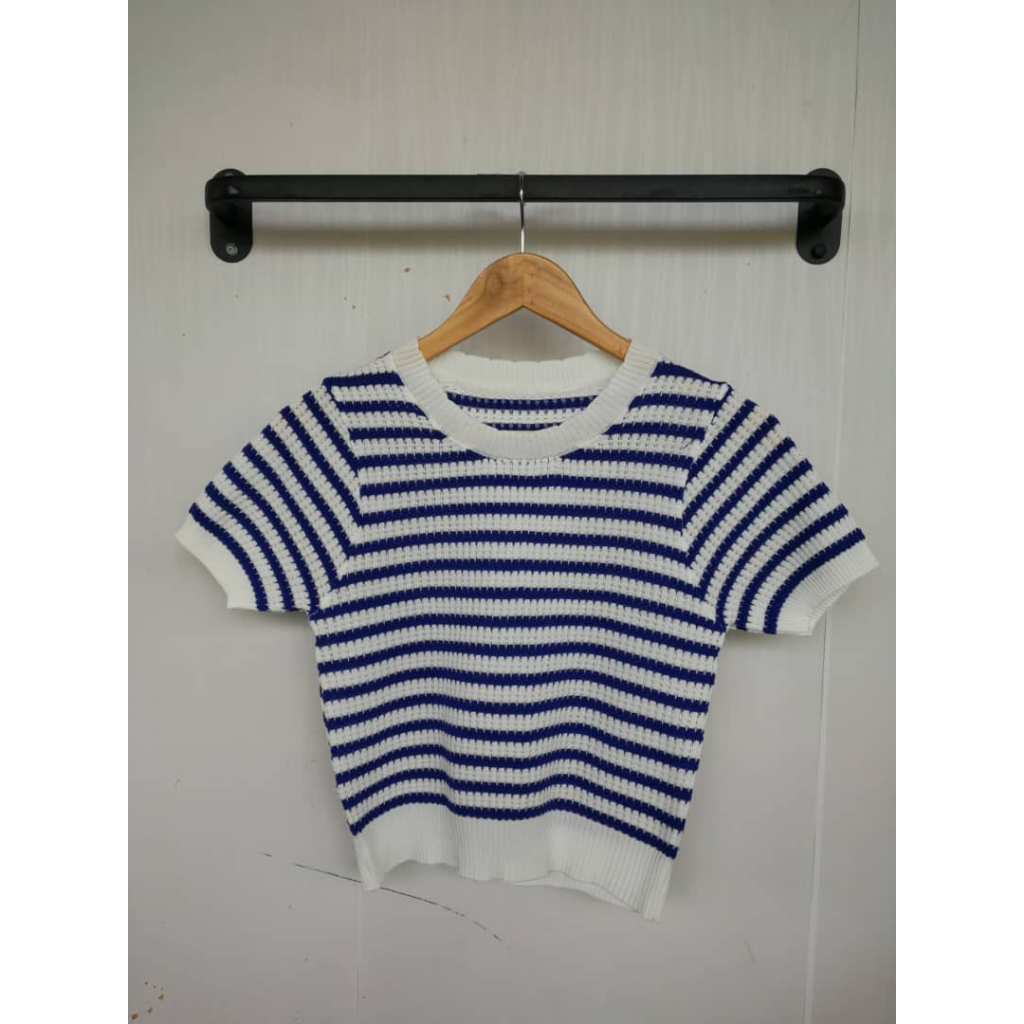 SA6242 -M'SIA Stok Sedia Fesyen Baju Wanita.Ready Stock Knitted Material Women Top 条纹针织短袖T恤