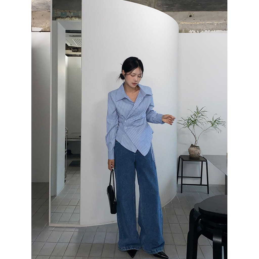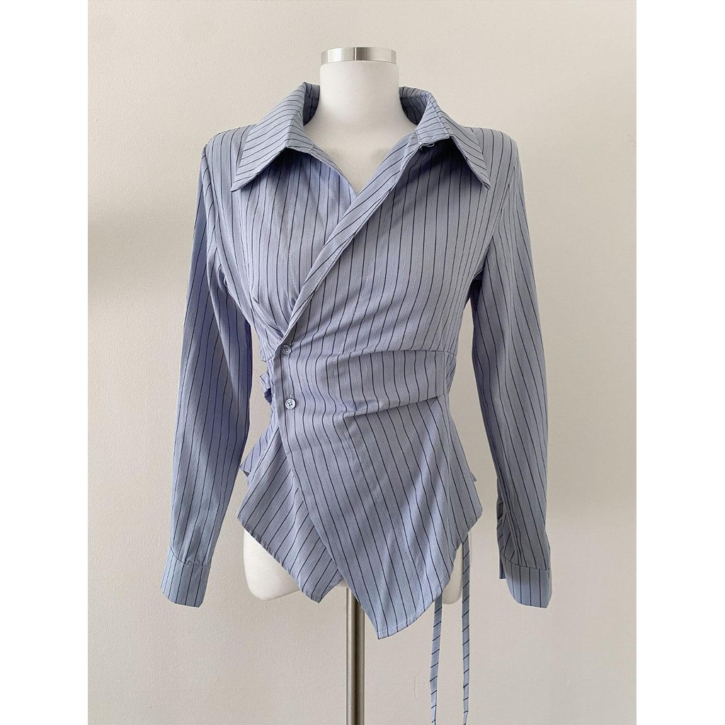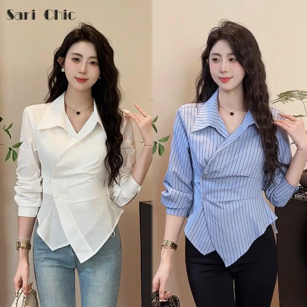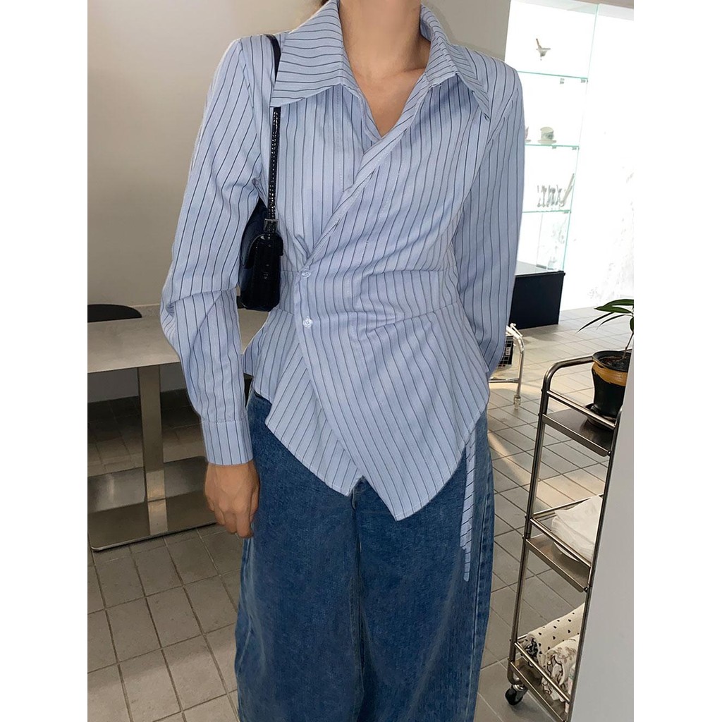 Sari Chic Blue Striped Long-Sleeved Shirt, Slim Fit, Irregular Length, Korean Style Women V-Neck Blouses Top W402