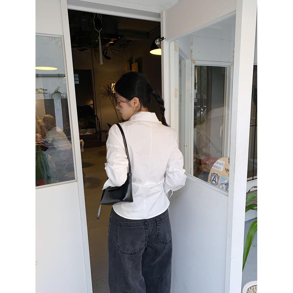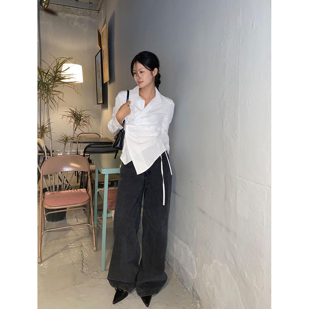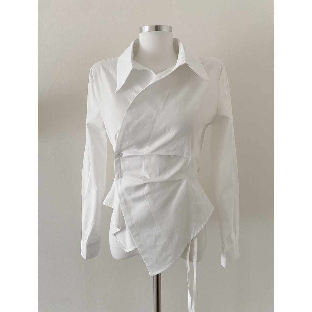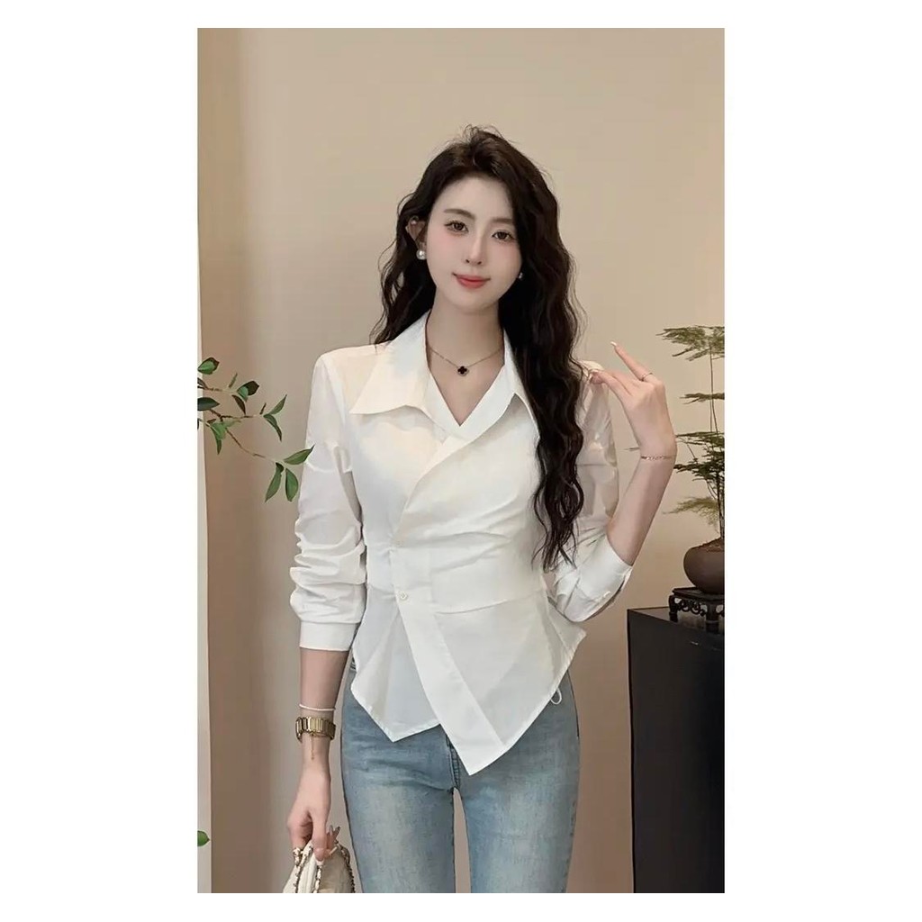 Sari Chic Blue Striped Long-Sleeved Shirt, Slim Fit, Irregular Length, Korean Style Women V-Neck Blouses Top W402