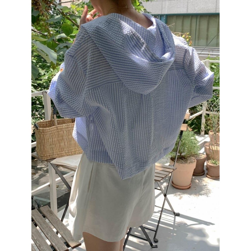 Sari Chic Korean Style Long Sleeve Blue Striped Shirt Women Summer Thin Sun Protection Hooded Cardigan w441