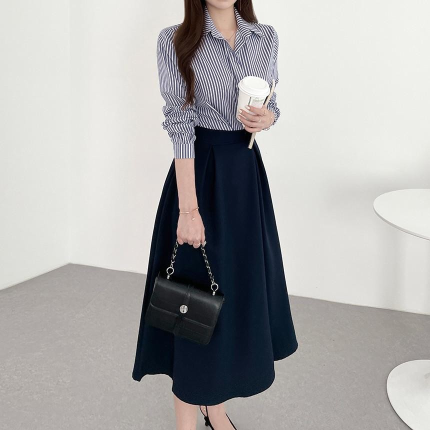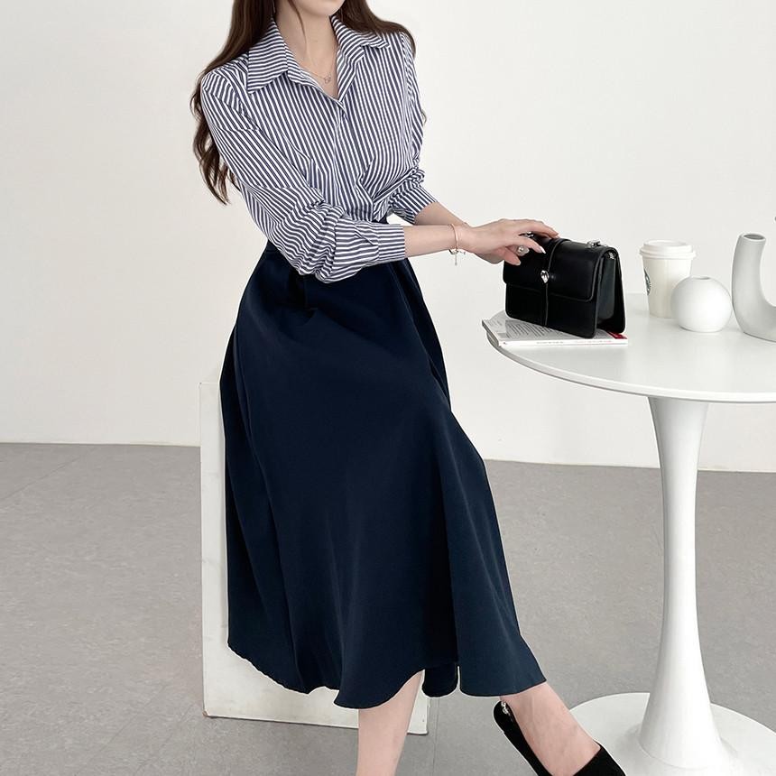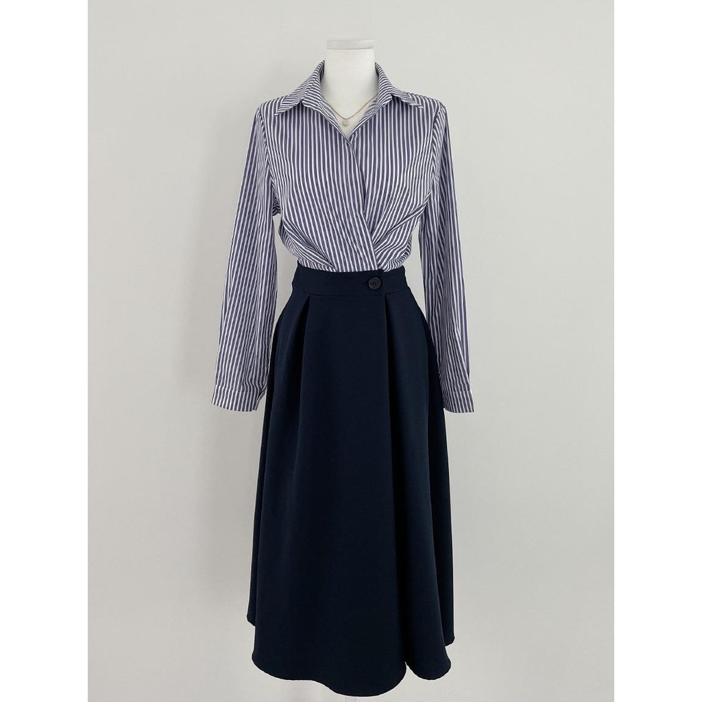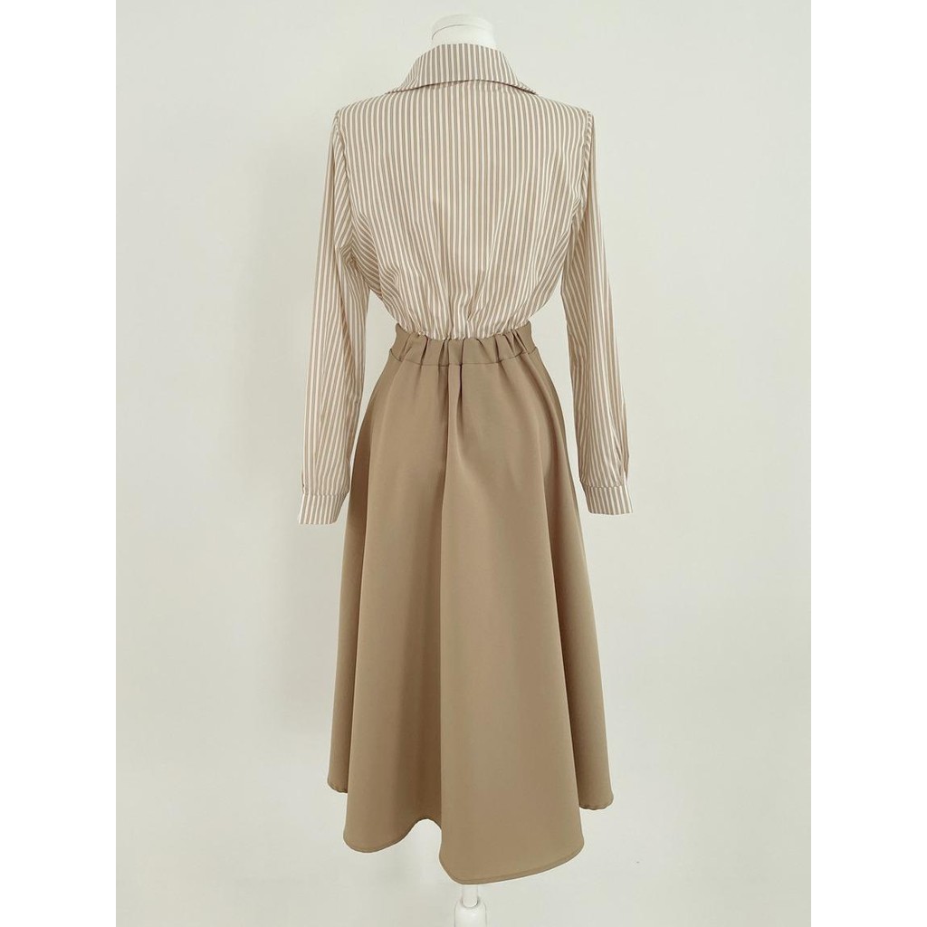 SARICHIC Baju Muslimah Polo Collar Stripes Fake Two-Piece One Button Waist Design Fashion Maxi dress for Women -99171