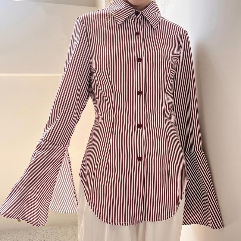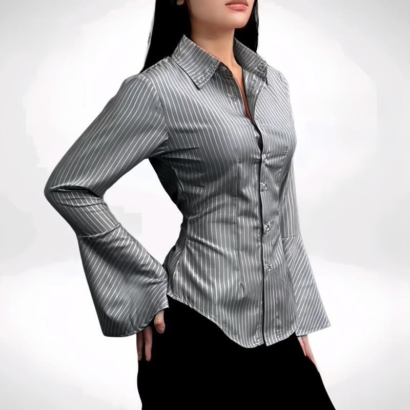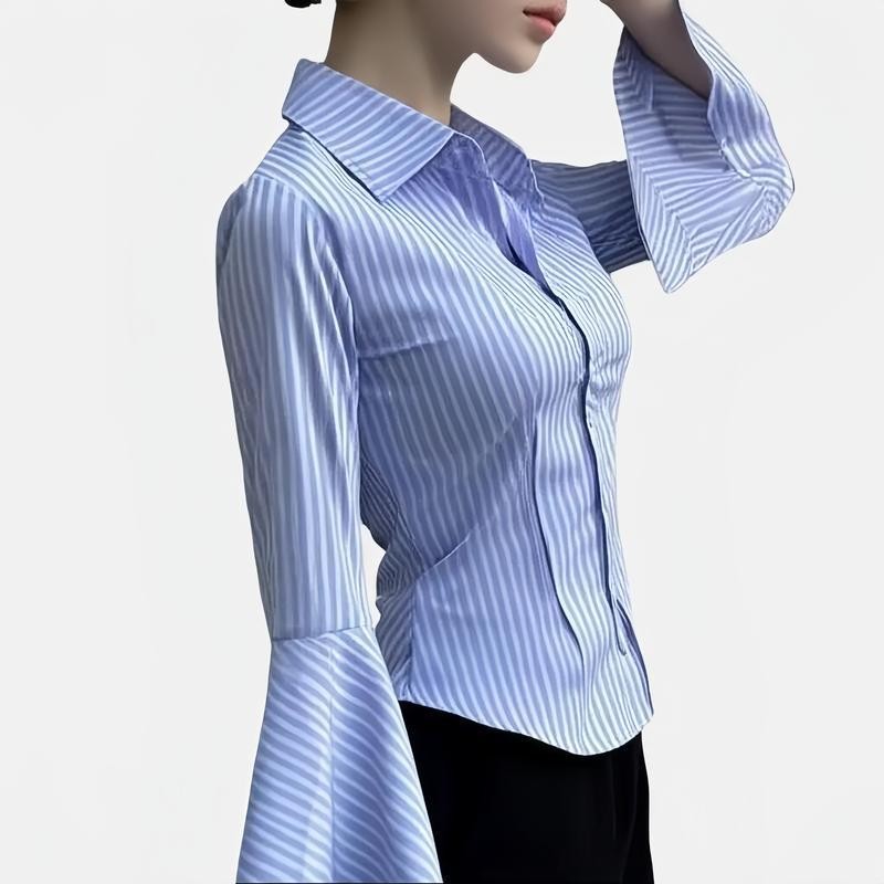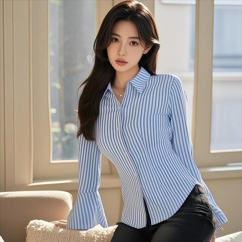 SARICHIC Kemeja Berjalur Lengan Panjang Wanita Jalur Menegak Klasik Reka Bentuk Pembukaan Cuff Slim Fit 99126