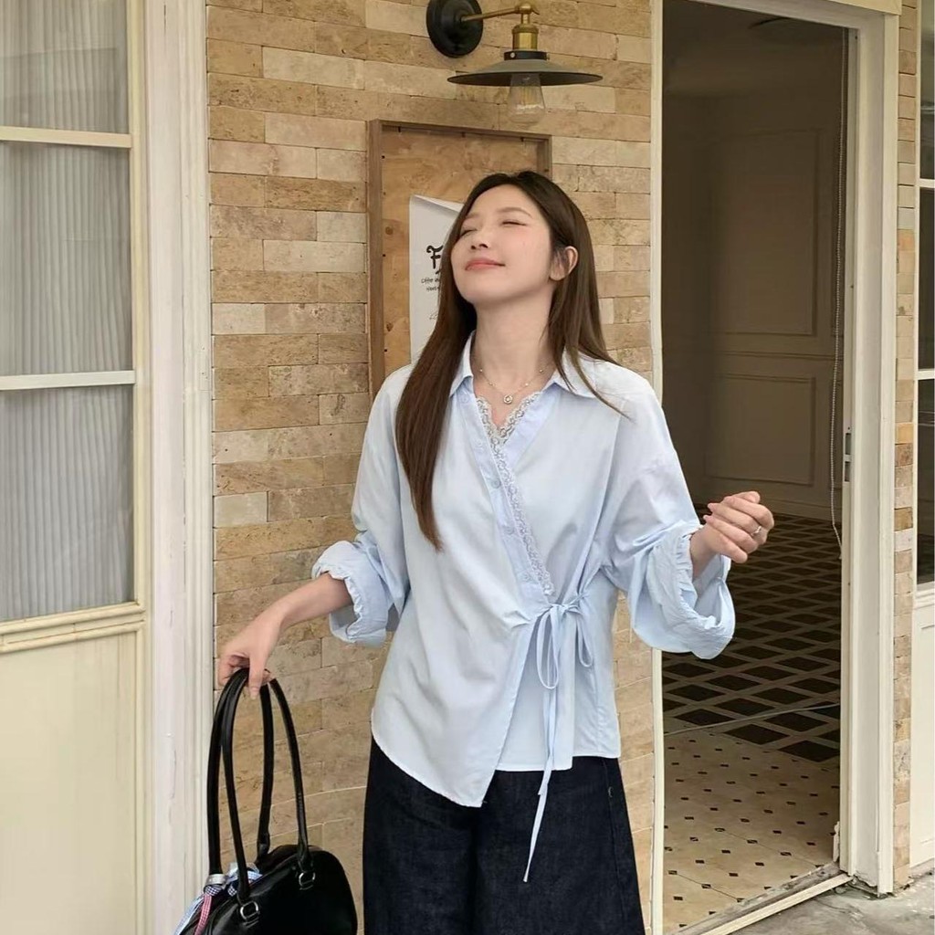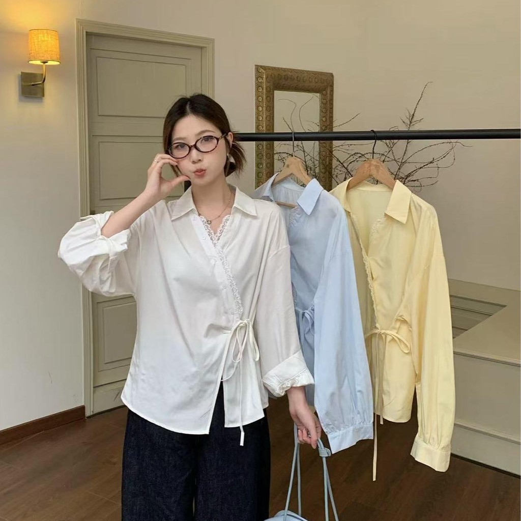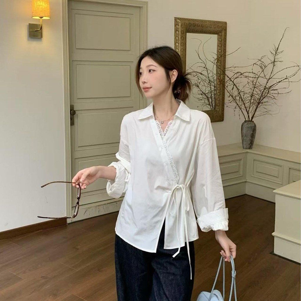SARICHIC Long-sleeved shirt cross-button front, bow tie on the side, Korean style white blouse for women -99199