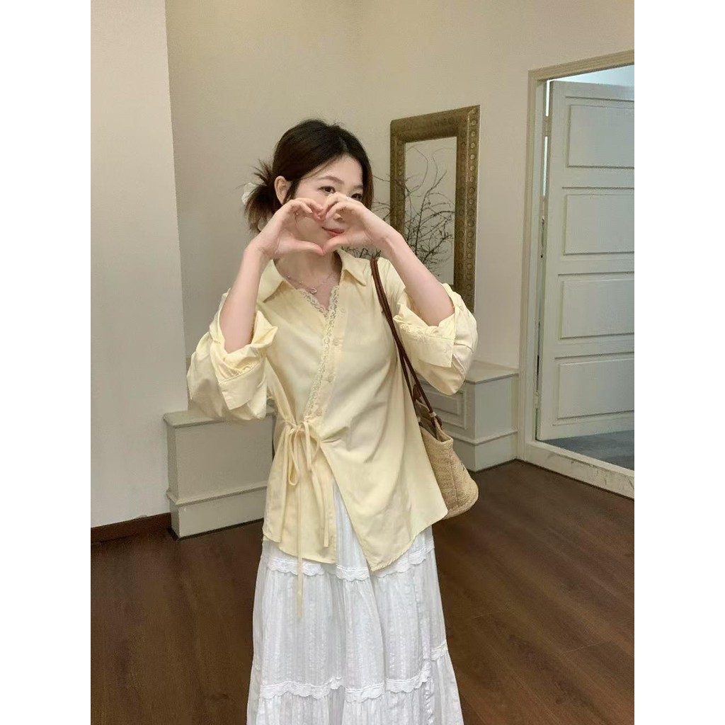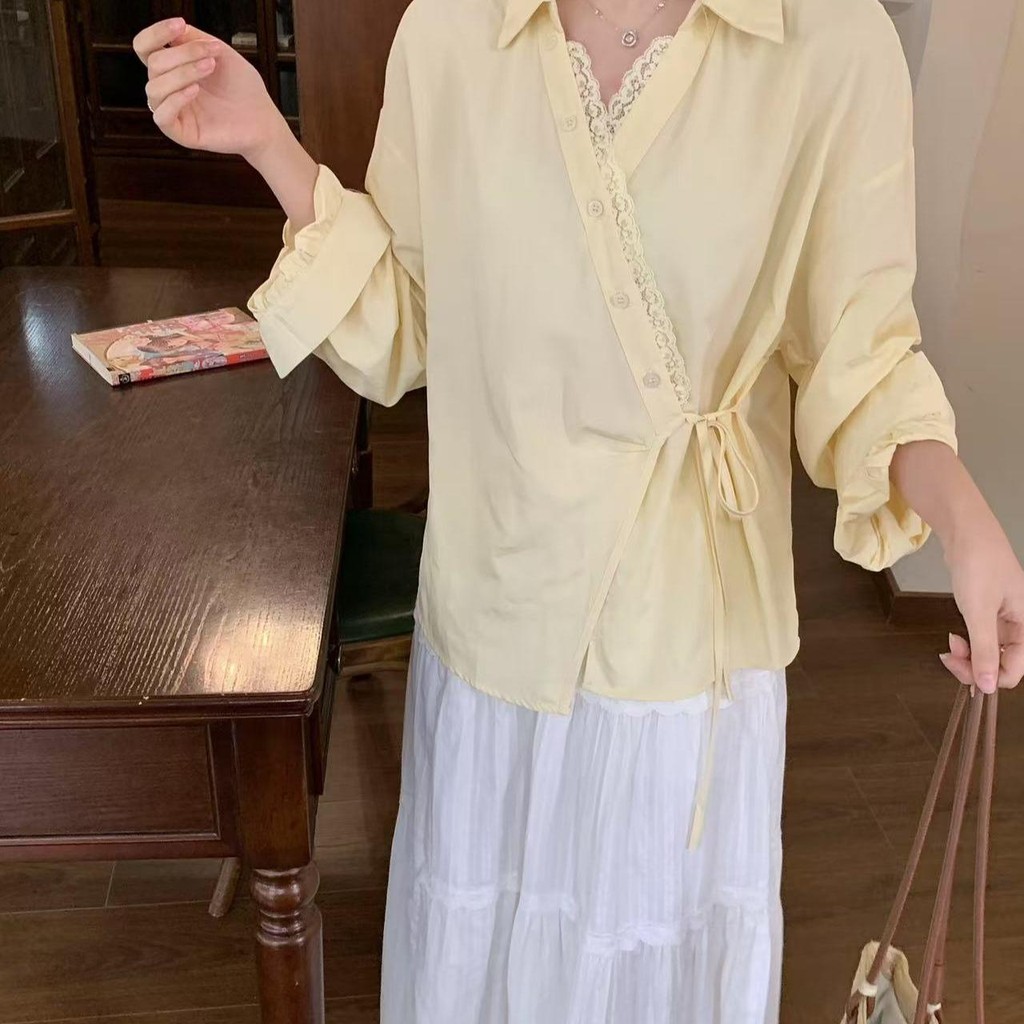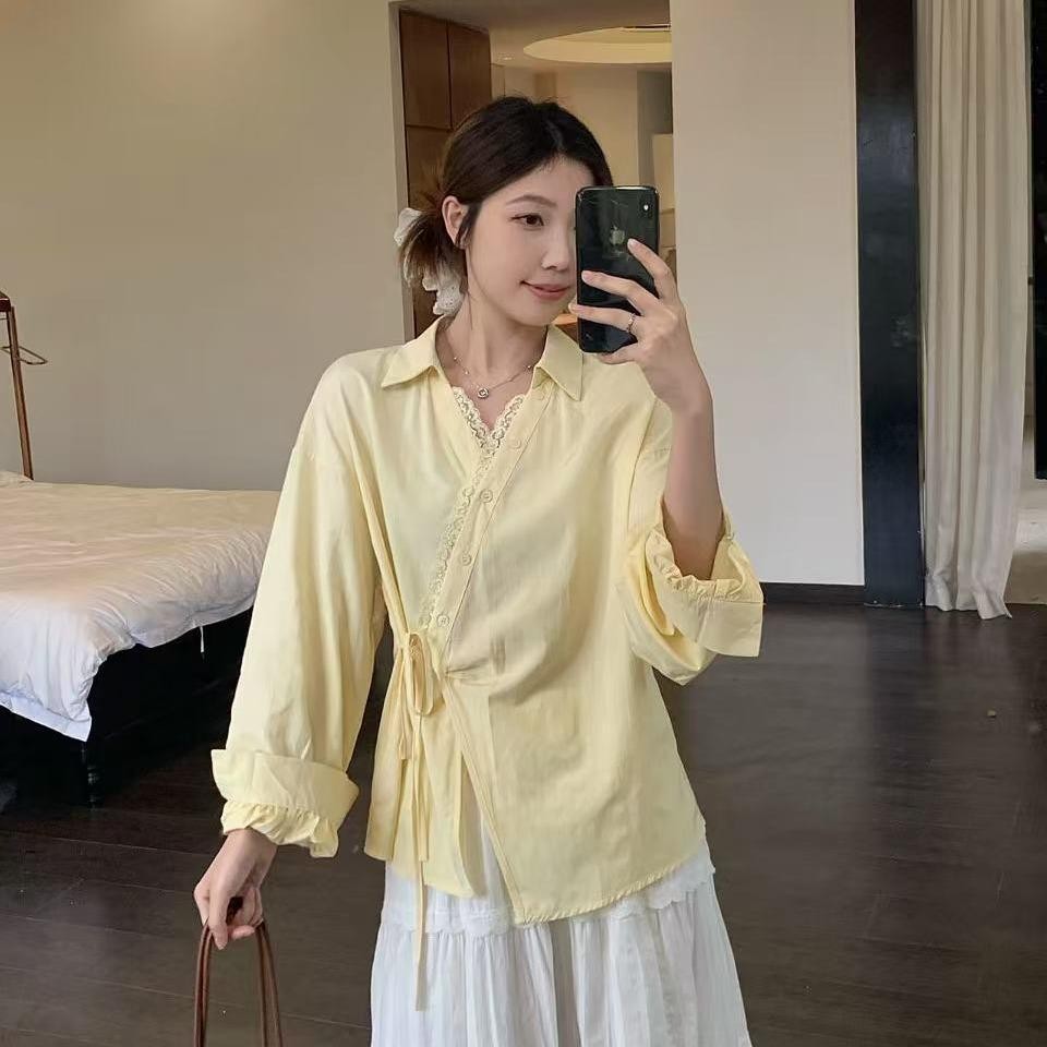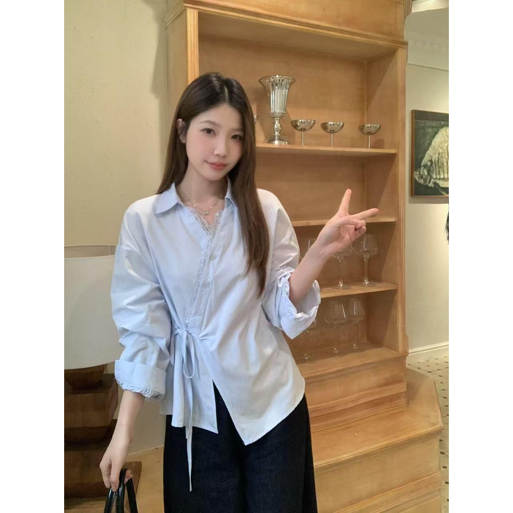 SARICHIC Long-sleeved shirt cross-button front, bow tie on the side, Korean style white blouse for women -99199