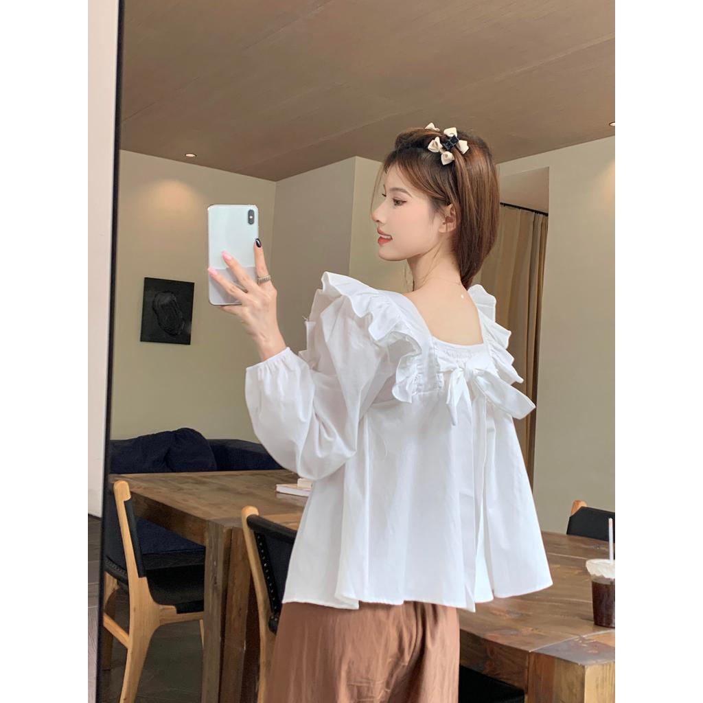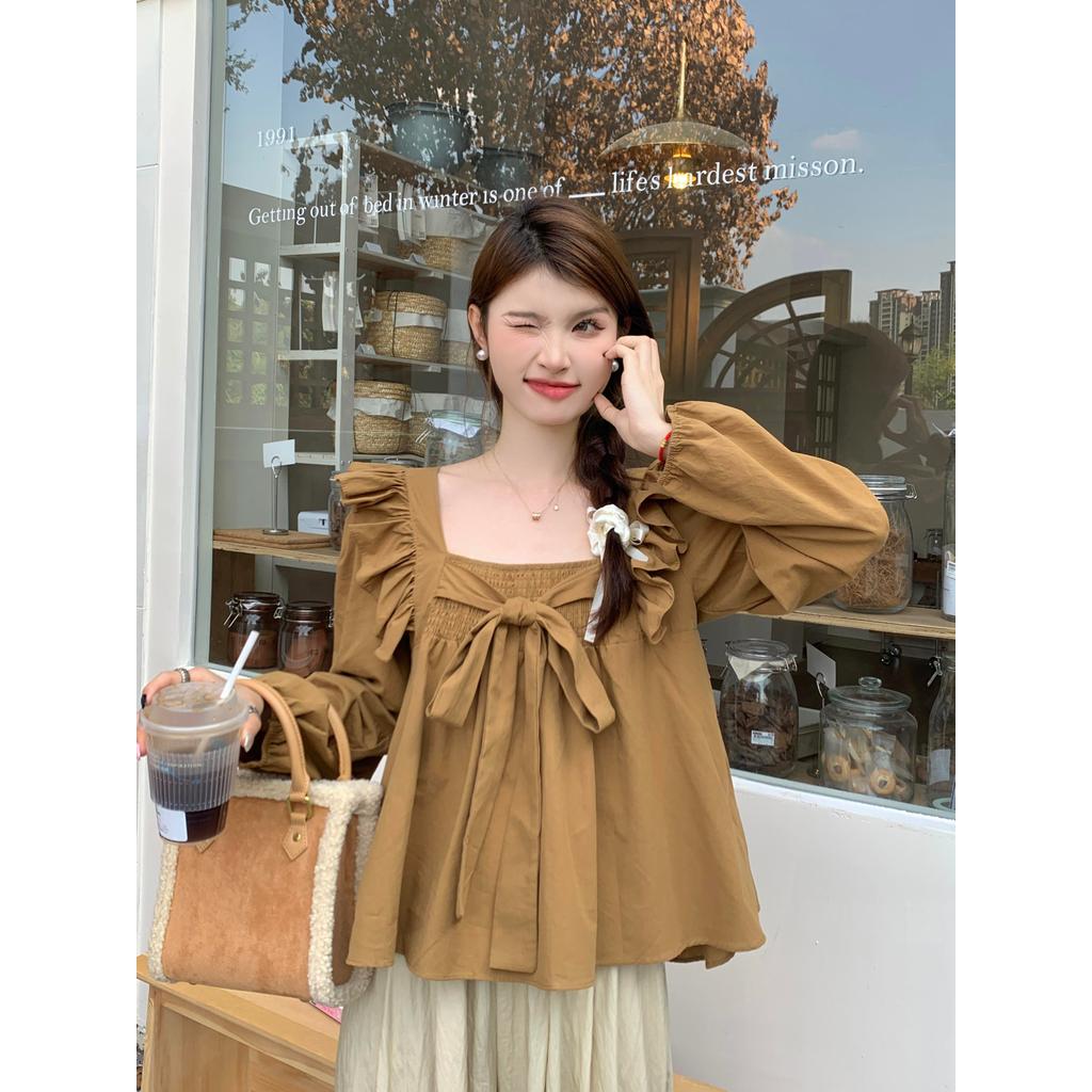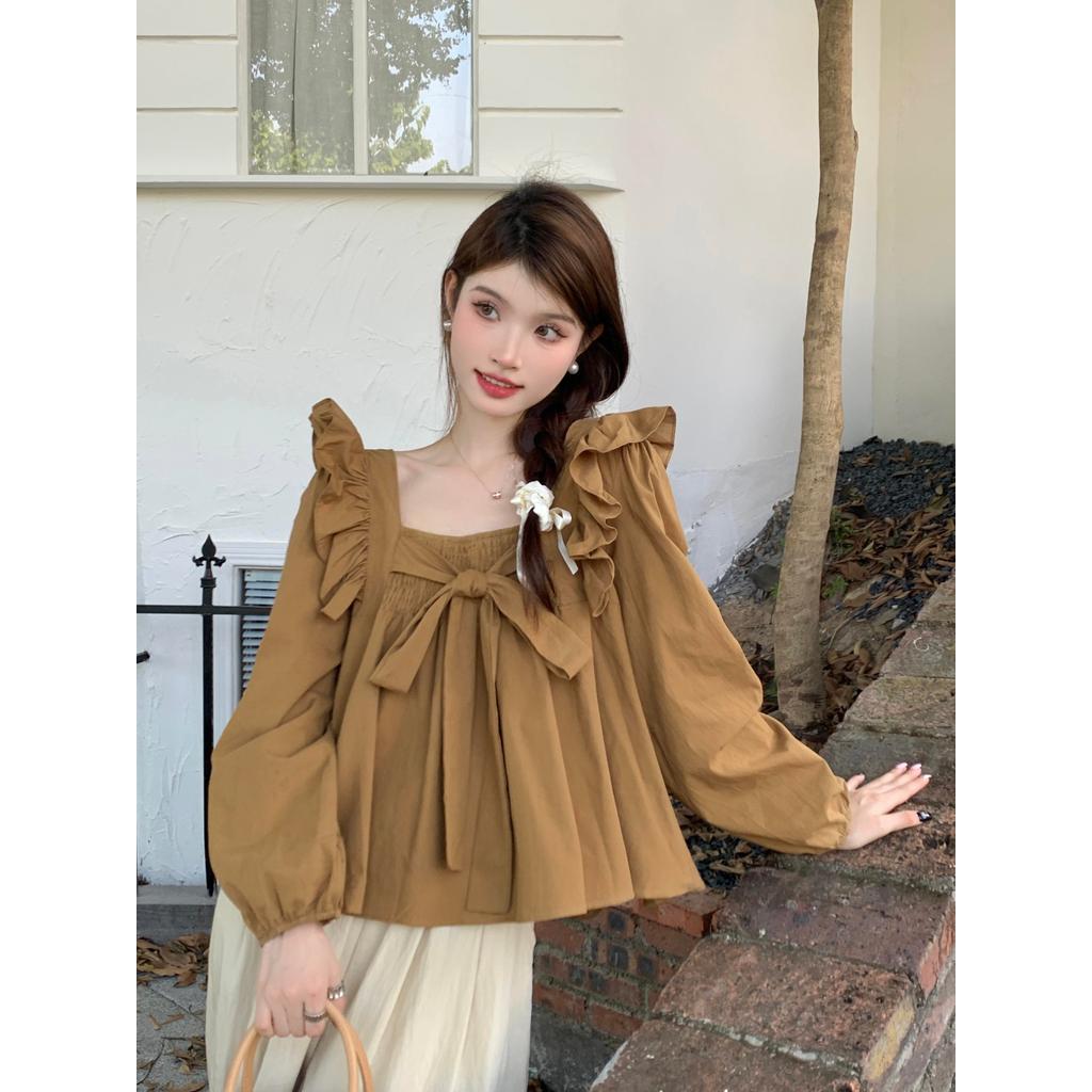 SARICHIC Women's French Square Neck Bowknot Long Sleeve Shirt Back Pleated Ruffles, Loose Fit -W672