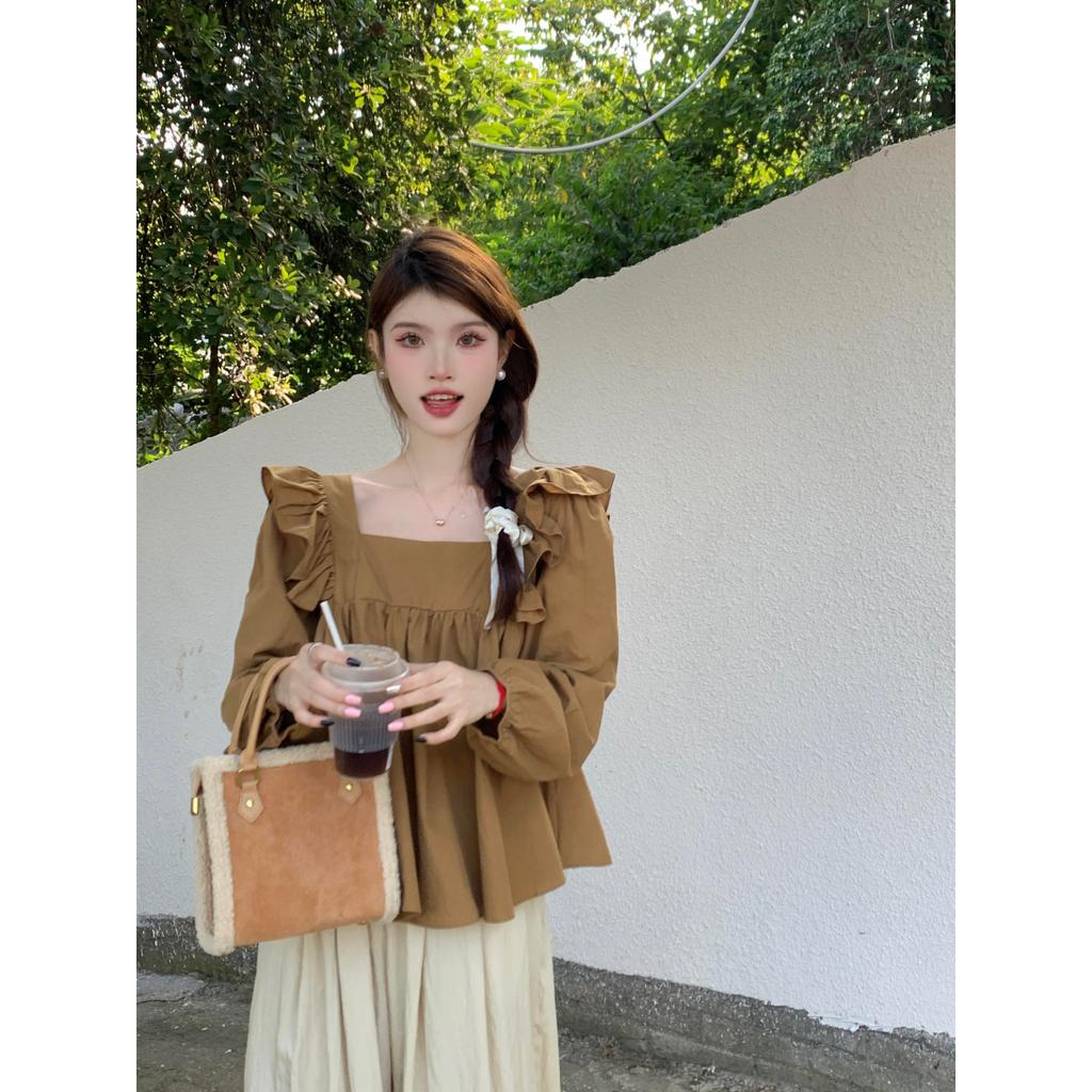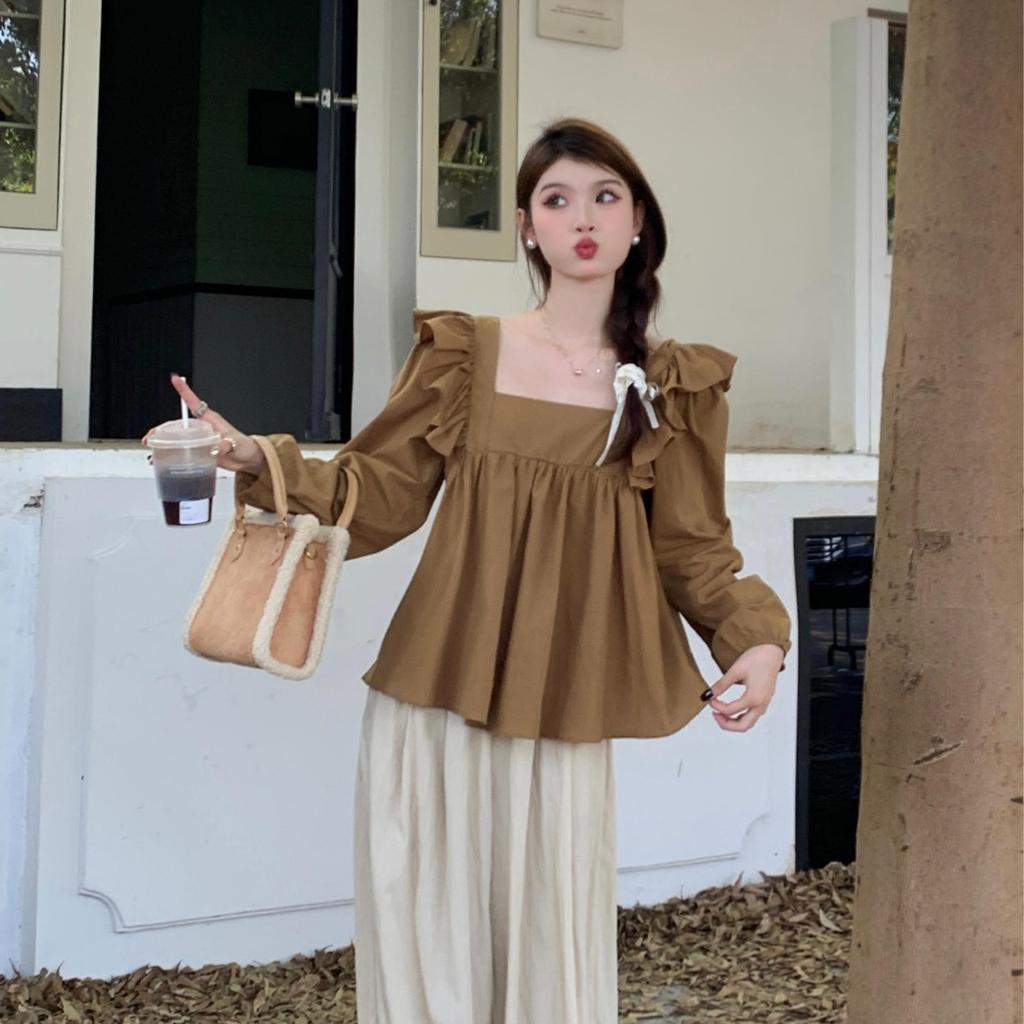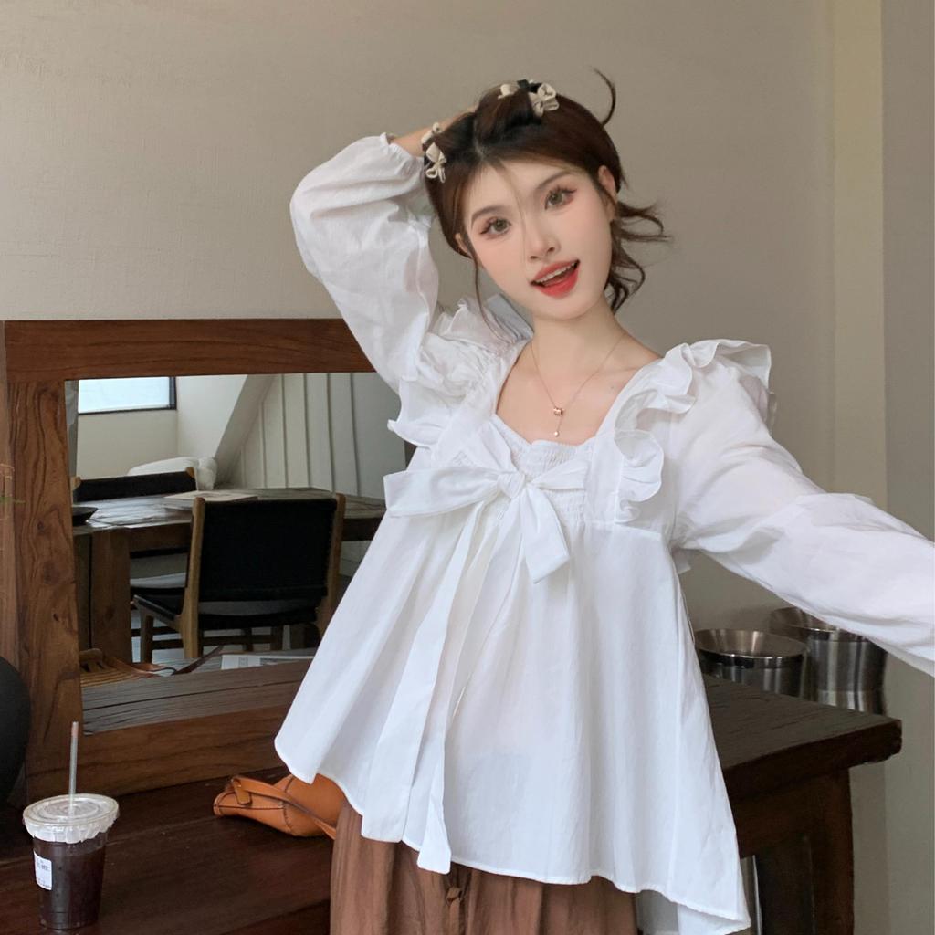 SARICHIC Women's French Square Neck Bowknot Long Sleeve Shirt Back Pleated Ruffles, Loose Fit -W672