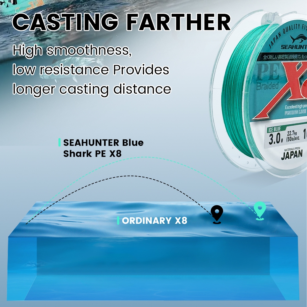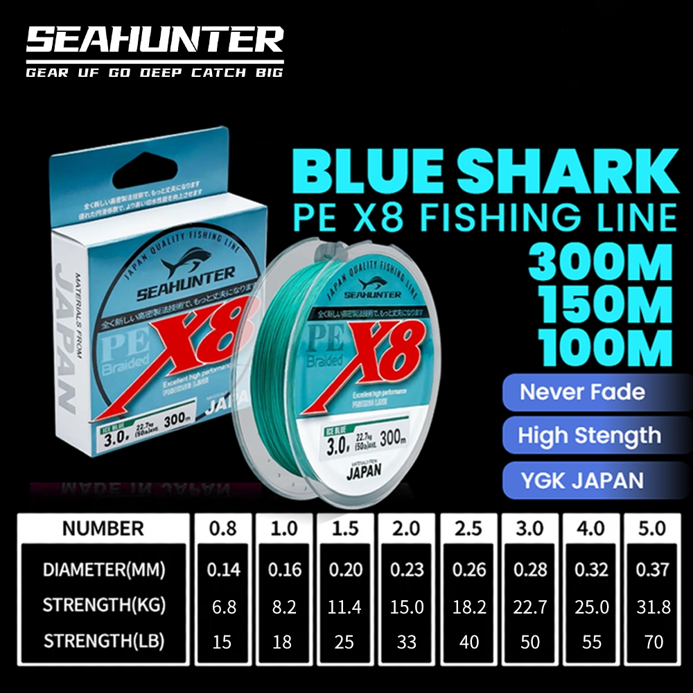 SEAHUNTER Shark Fishing Line PE X8 Braided Multifilament Line - Blue (100M/150M/300M/15-70lb)