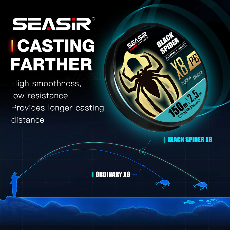 Seasir P-Series Black Spider x8 Braided PE Fishing Line Ice Blue 8 Strands Pe Fishing Main Line 150M 16-40Lb Upgrade