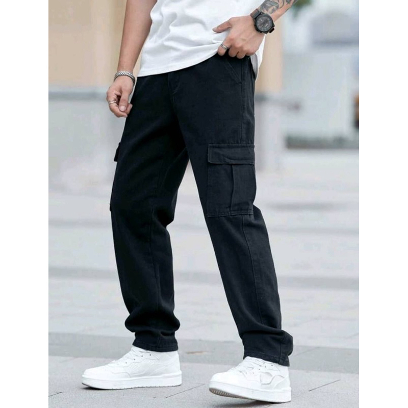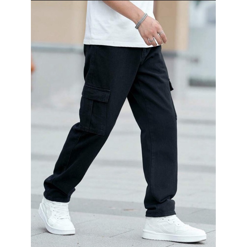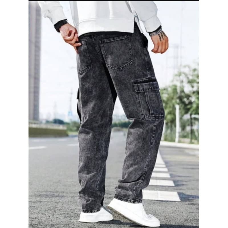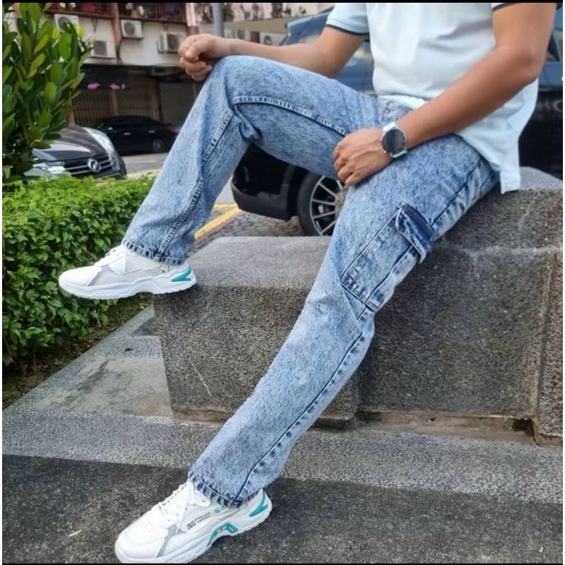 Seluar Jeans Lelaki Cargo 6 Pocket Acid Wash Cargo Jeans kain ( Non Stretchable ) straight Cut Seluar Cargo Jeans