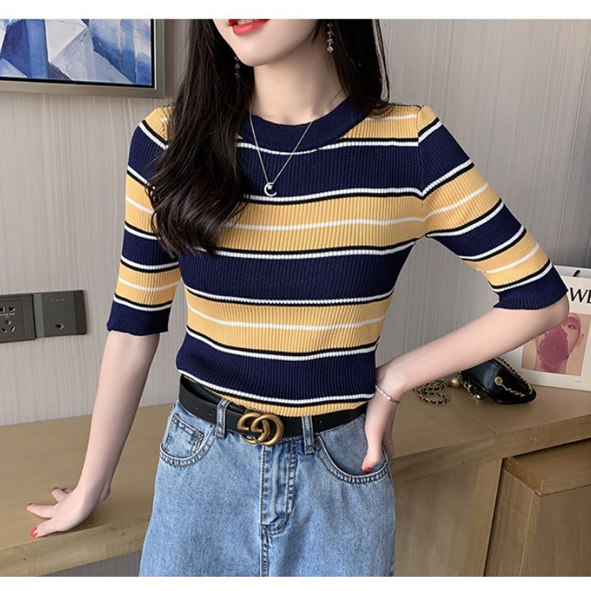 SK2049 -Fesyen Baju Siap Stok Malaysia.Ready Stock Knitted Material Women Top短袖条纹针织衫