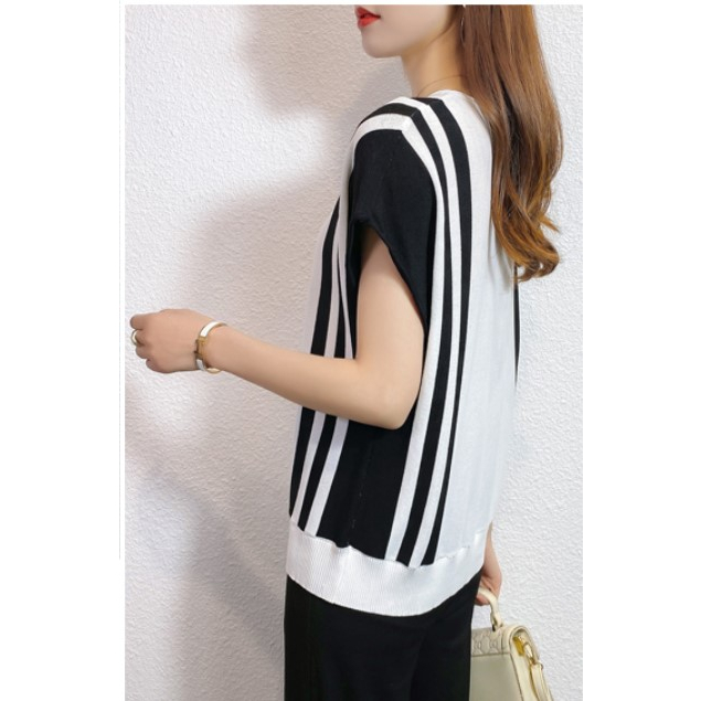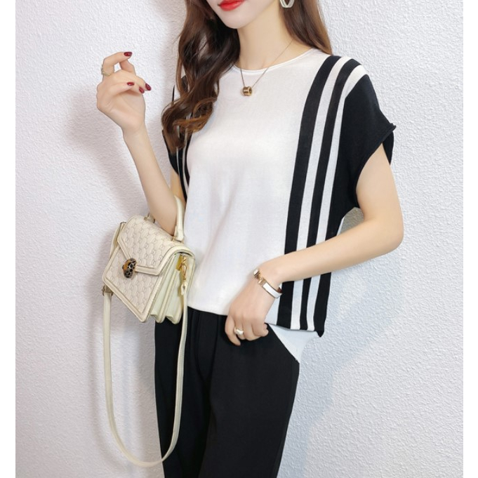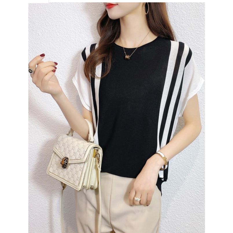 SK4319 -Fesyen Baju Siap Stok Malaysia. Ready Stock Knitted Material Women Top Knitwear条纹短袖冰爽丝针织衫薄