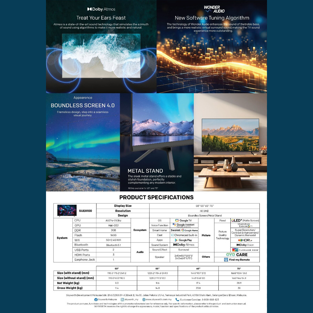 SKYWORTH 50"/55"/65"/75" 4K UHD Google QLED TV SUE8100 | Dolby Atmos | Flicker Free | Bluetooth 5.1