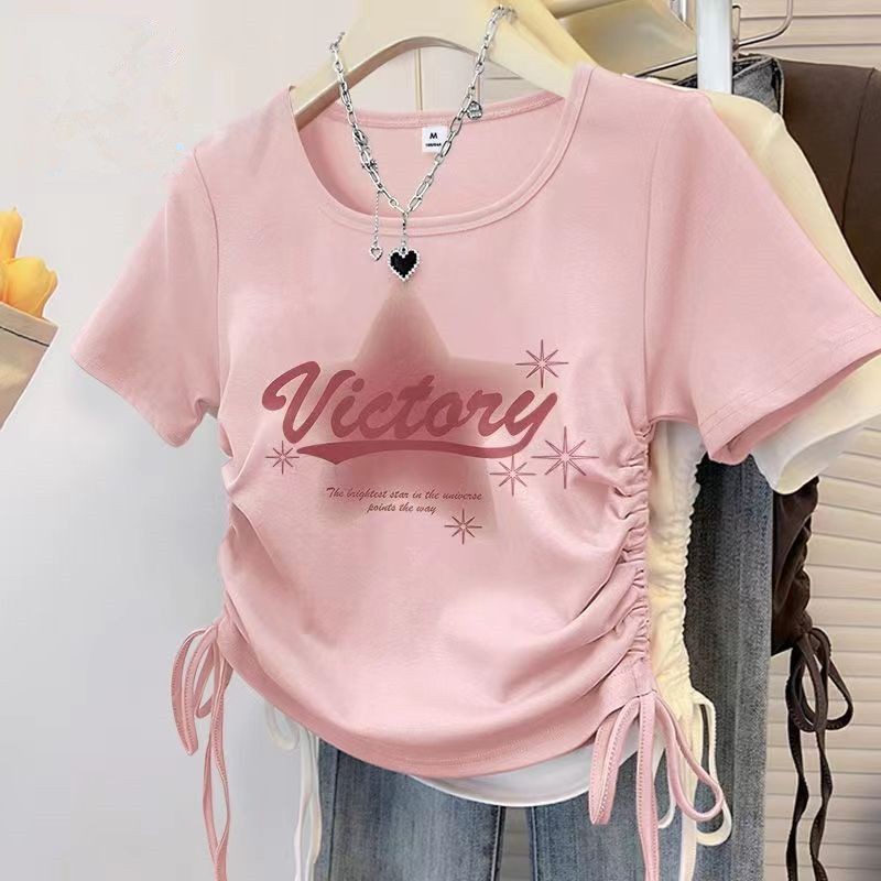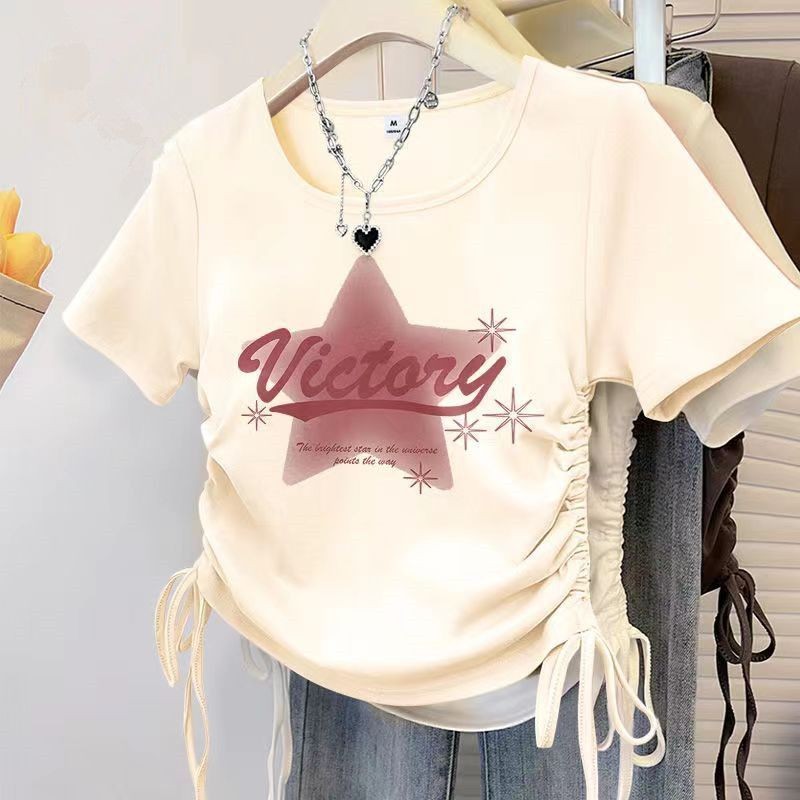 【Spots现货】短款女上衣2024夏季新款甜辣风露腰印花短袖体恤小众抽绳正肩T恤Short Women's Top 2024 Summer New Style Sweet and SpicyNew shorts