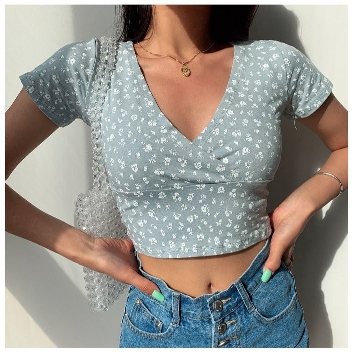 (Stock in KL-062) Women's Floral Crop Top V-neck Short cropped T-shirt American Style Retro