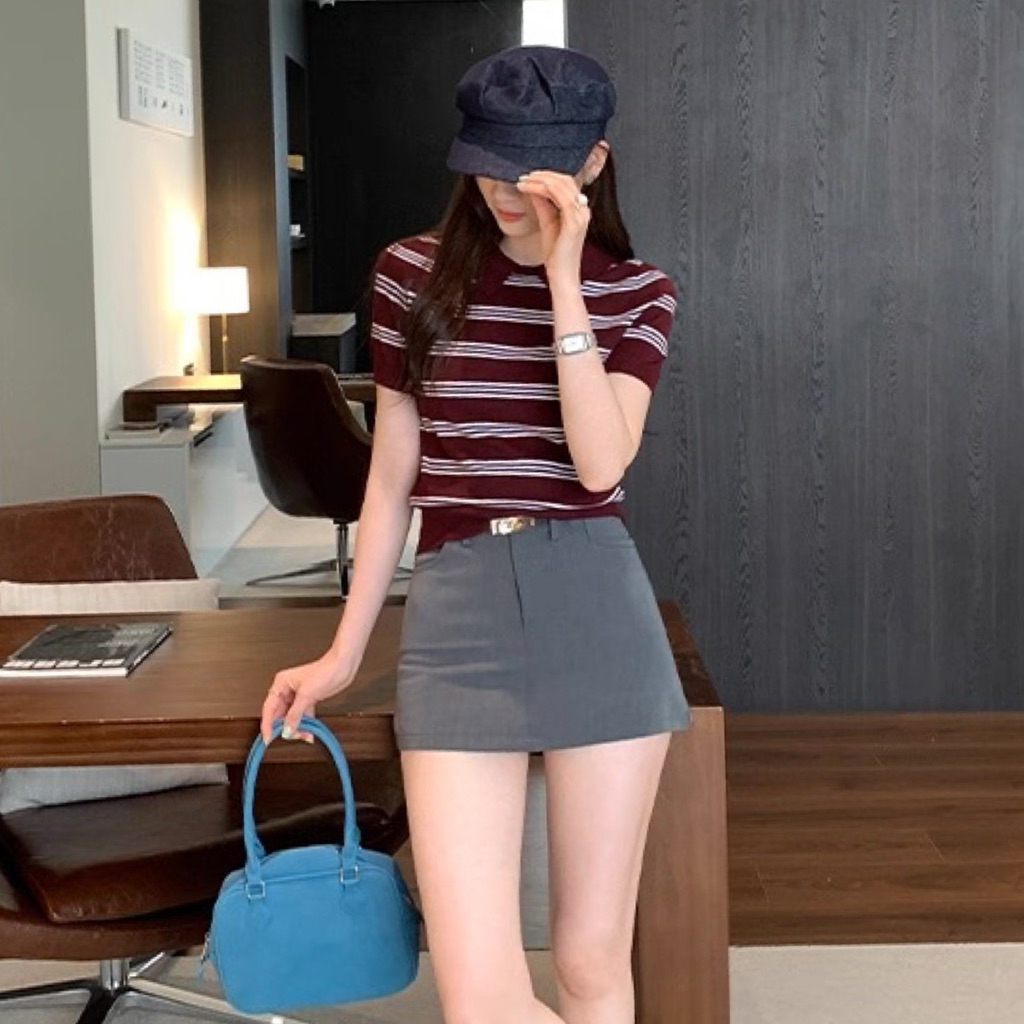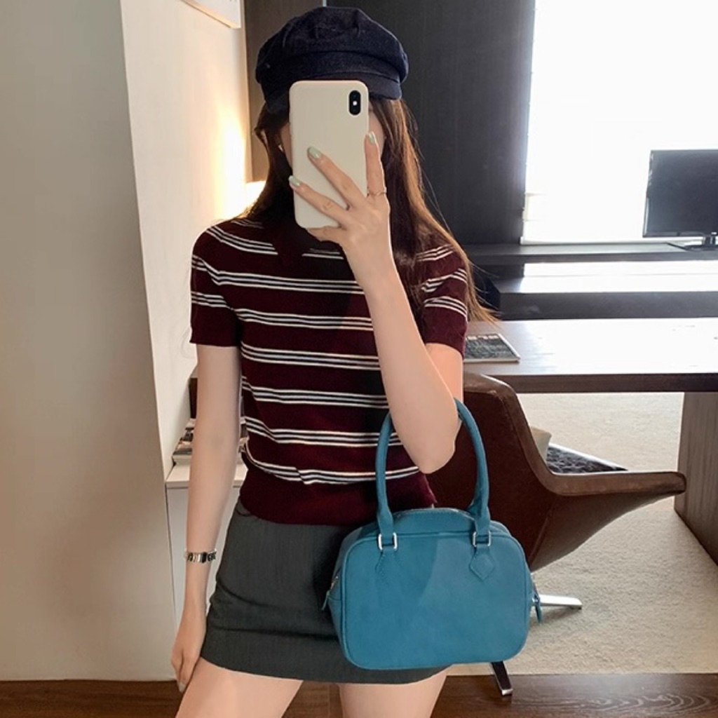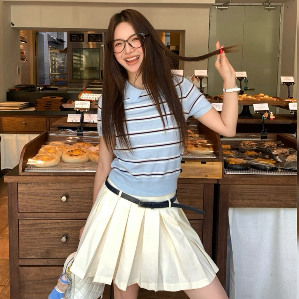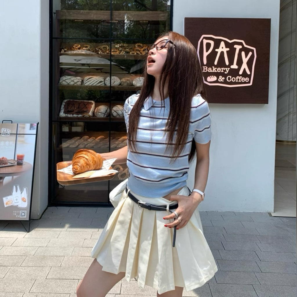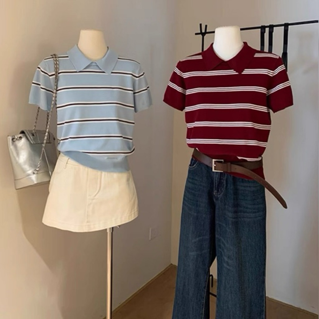 (STOK SEDIA) Aella Striped Knitted Short Sleeve Top T-shirt 百搭撞色复古条纹翻领短袖宽松针织上衣T恤 READY STOCK