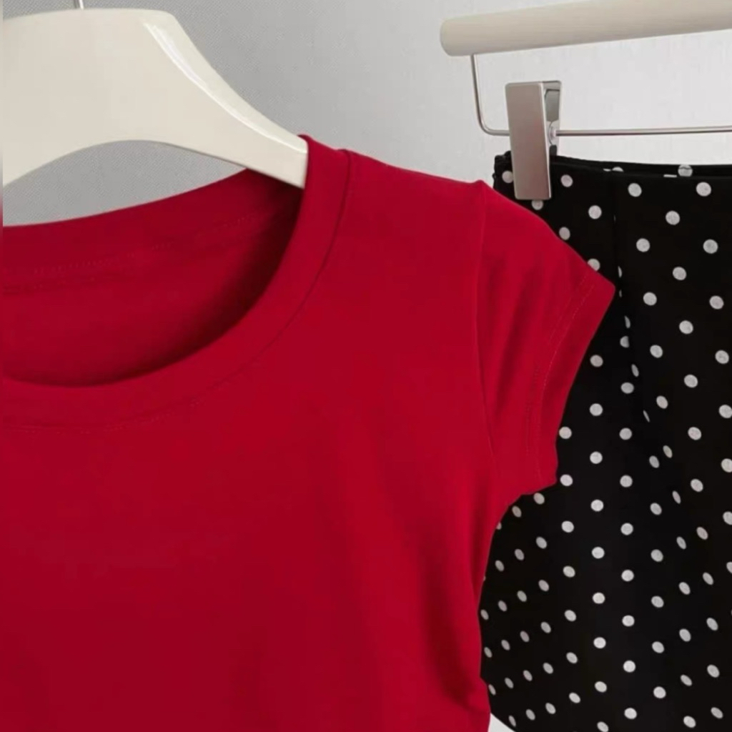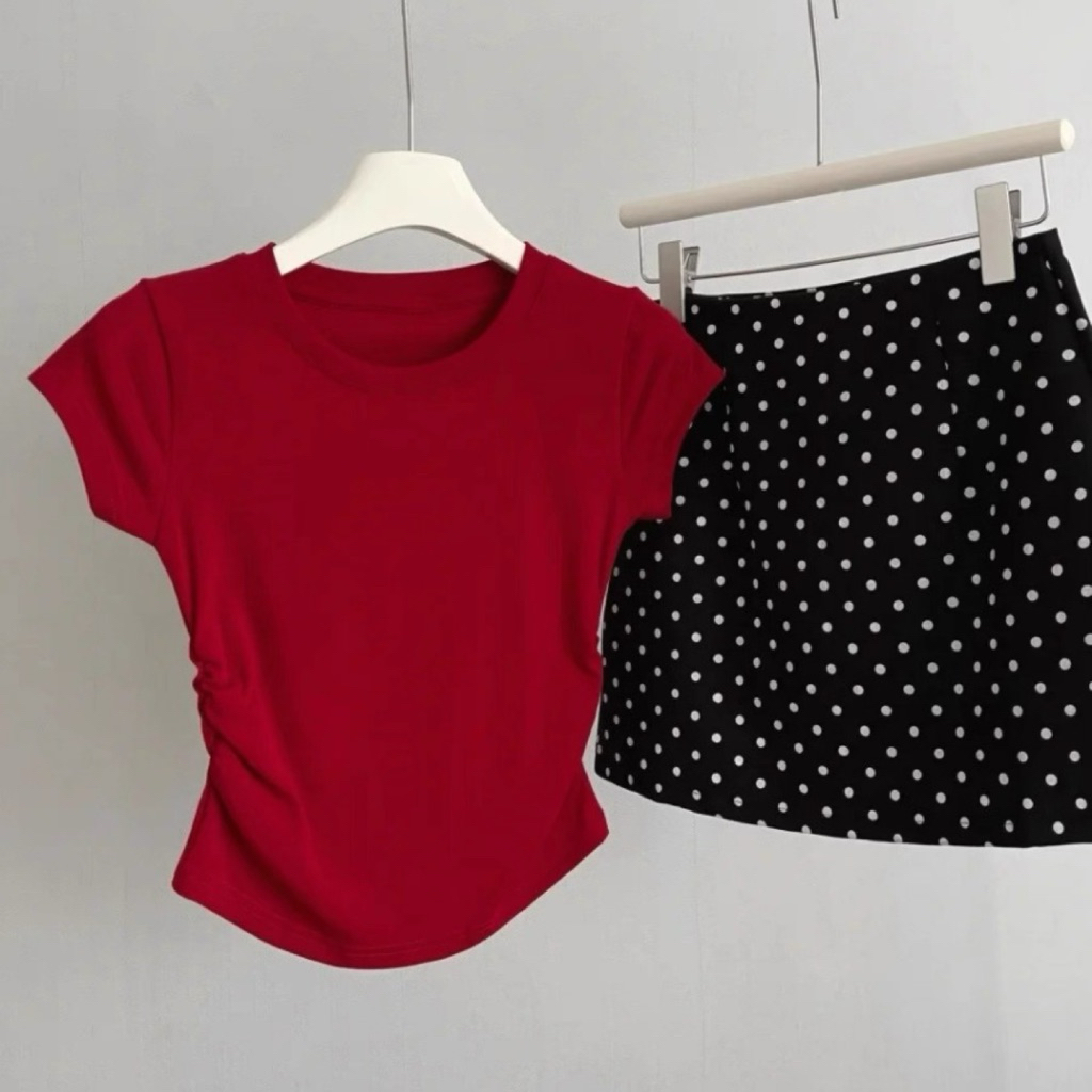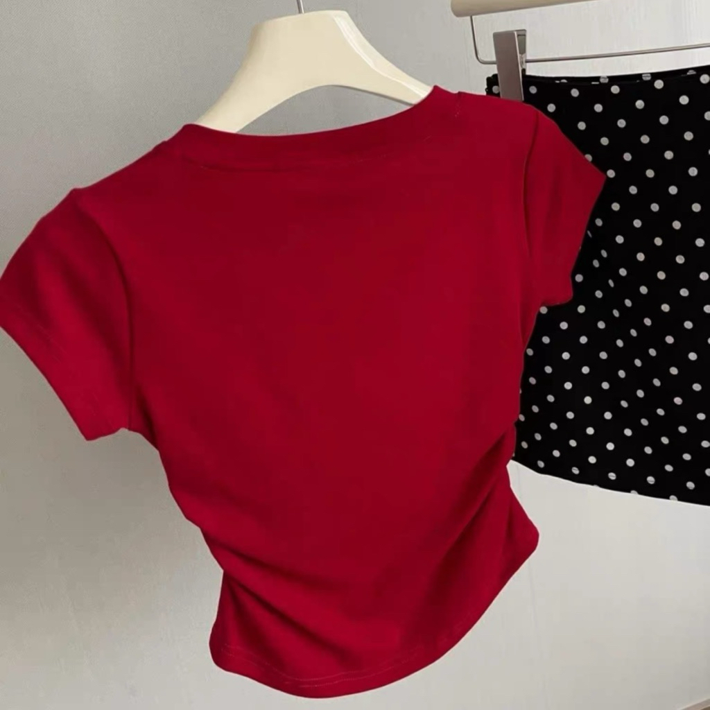(STOK SEDIA) CNY Myra Red Cotton Round Neck Short Sleeve Slim Fit Top T-shirt 新年款红色纯棉圆领短袖褶皱收腰正肩上衣T恤 READY STOCK