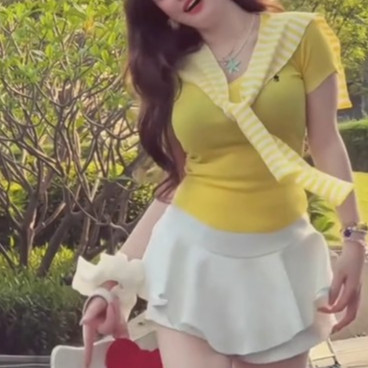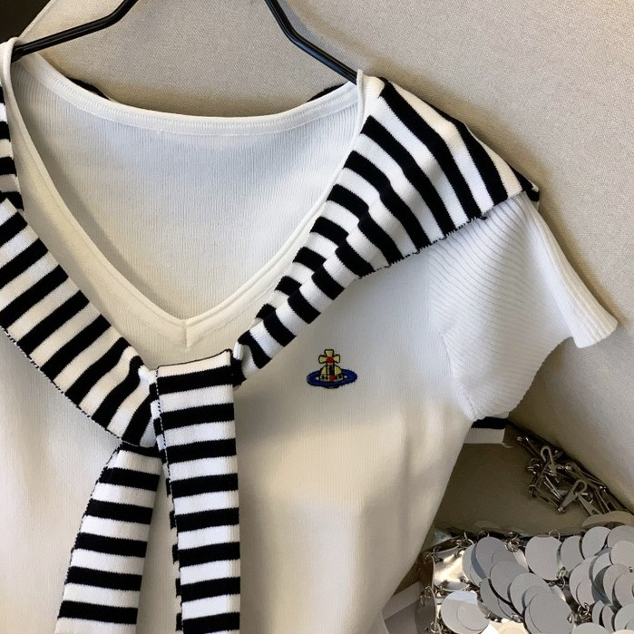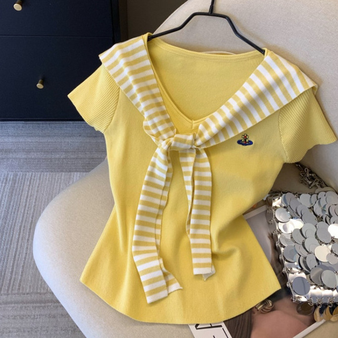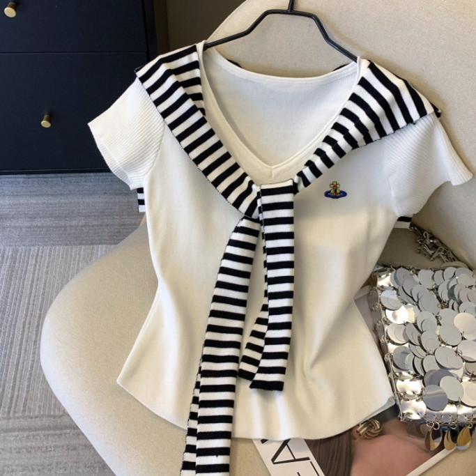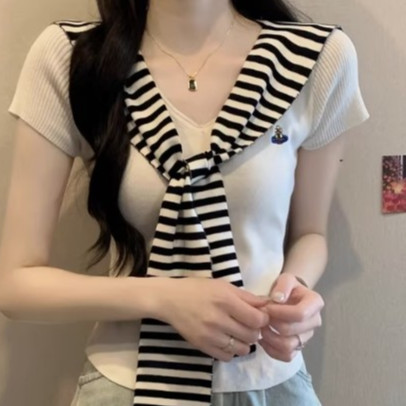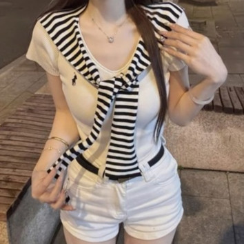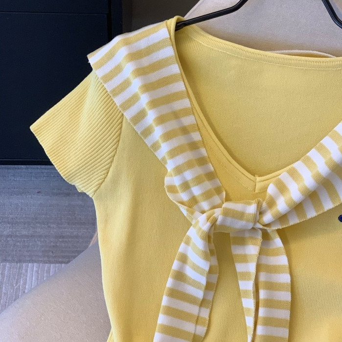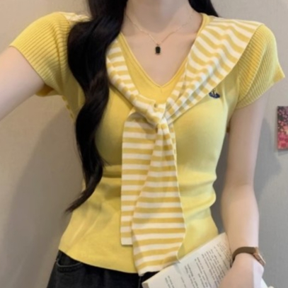 Striped Shawl Short-Sleeved t-Shirt Women Summer Thin v-Neck Knitwear Top