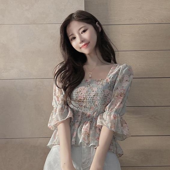 Summer 2021 Floral Square Collar Chiffon Blouse with Flounces At Waist To Slim Short Sleeves