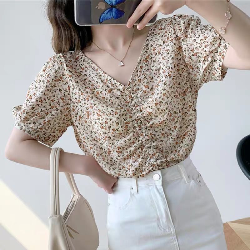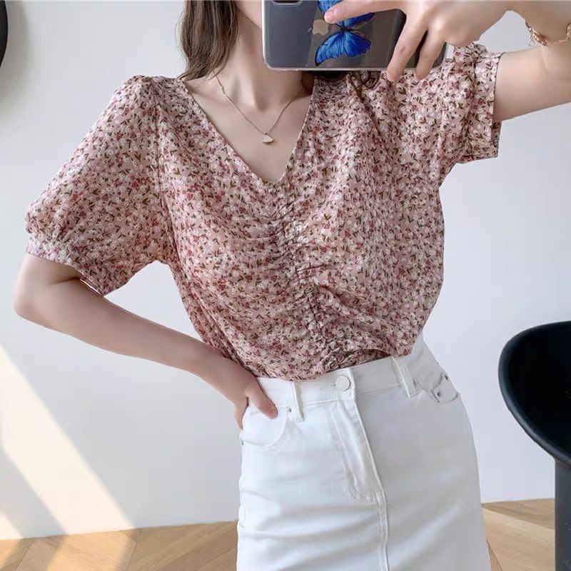Summer 2021 women's floral chiffon shirt v-neck short sleeve drawstring top