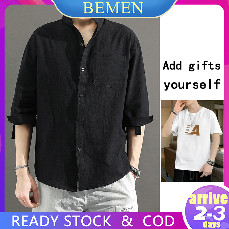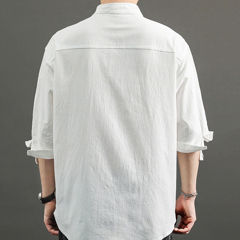 Summer linen shirt, men's 3/4-sleeve shirt, loose cotton shirt, black,M-5XL