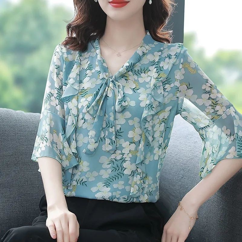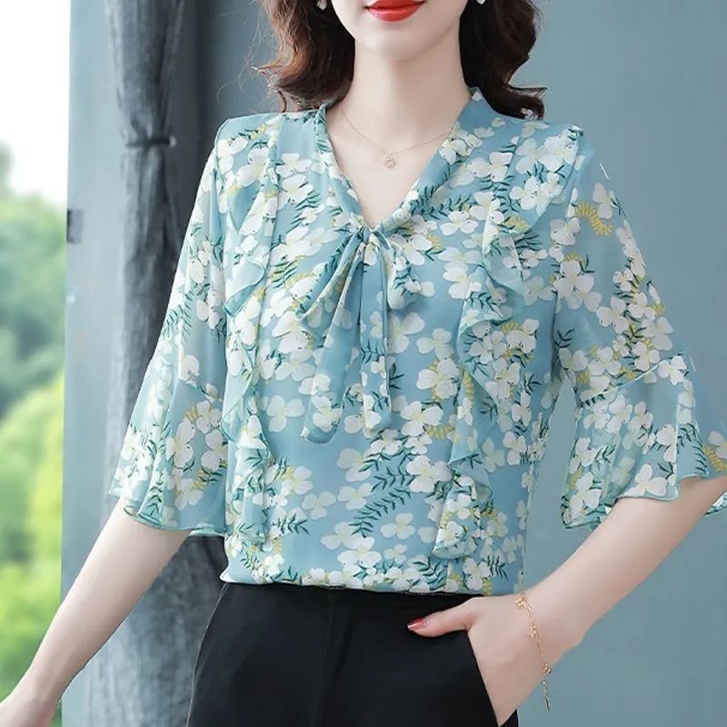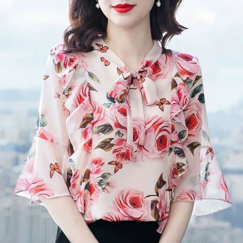 Summer Women Blouses Tops Floral Print Chiffon Blouse Fashion Bow Mid Sleeve Sleeve Female Shirts