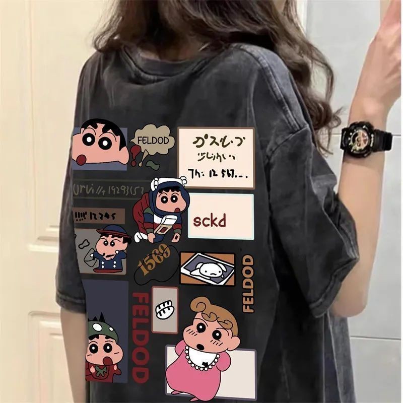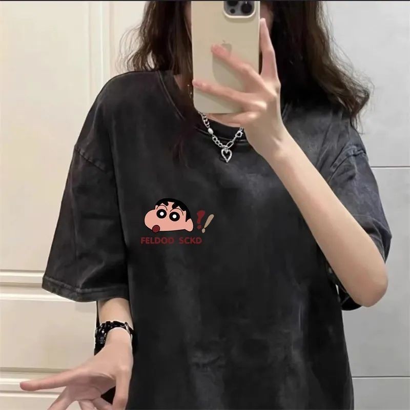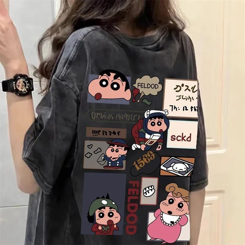 日系可爱百搭蜡笔小新印花T恤男女夏季新款水洗做旧复古短袖上衣Japanese Cute Versatile Crayon Shin chan Printed T-shirt for Men20240712