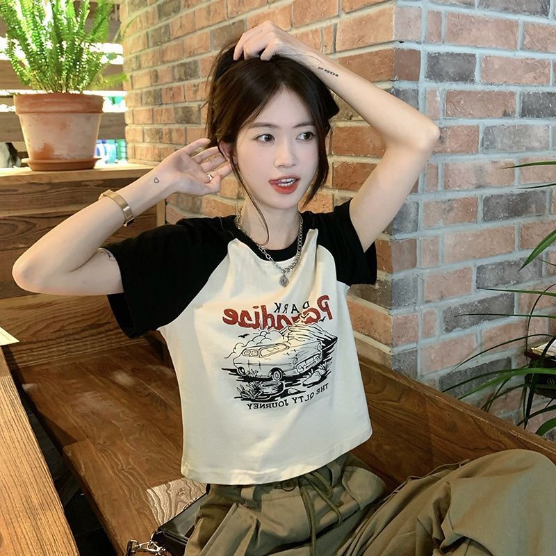 印花 短袖t恤女 Slim fit versatile short top for women ins tide 美式复古印花短袖T恤女2025夏季韩版新款修身百搭短款学生上衣潮 American Retro Printed Short-Sleeved T-Shirt Women 2025 Summer Korean Version New Style Slim-fit All-Match Short Student Top Trendy