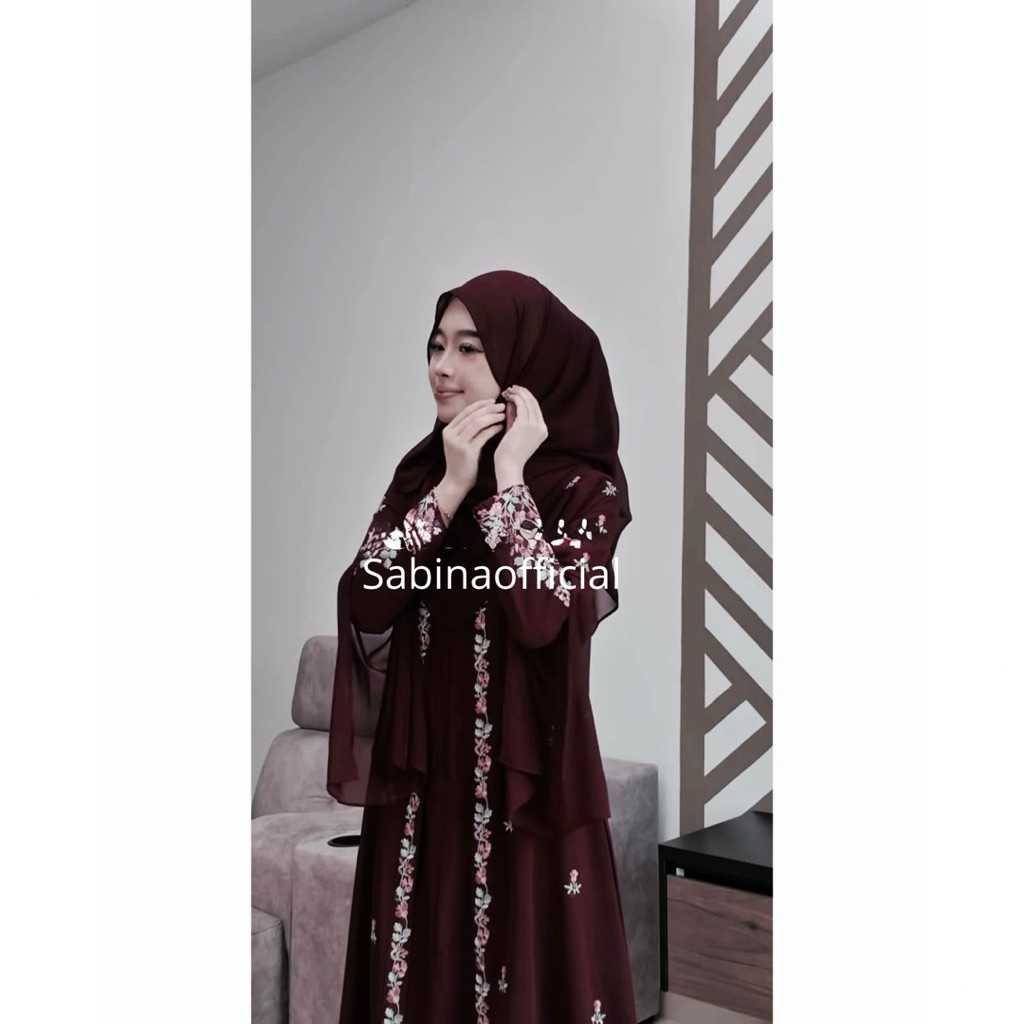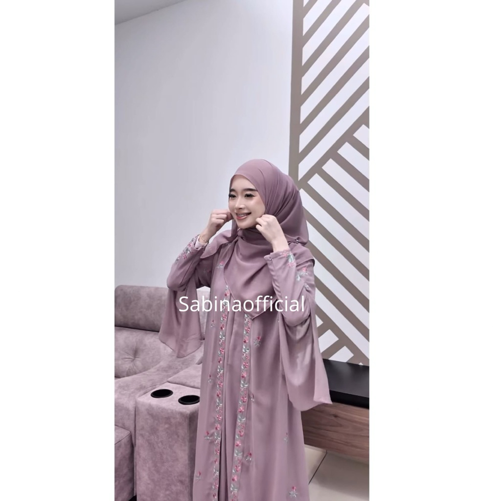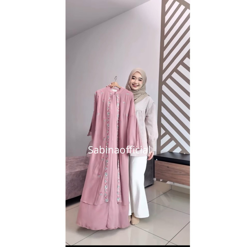 TRISHA ABAYA TWO LAYER EMBROIDERY APPLICATION CERUTY BABYDOLL MATERIAL FULL FRONT ZIPPER LINING BUSUI FRIENDLY