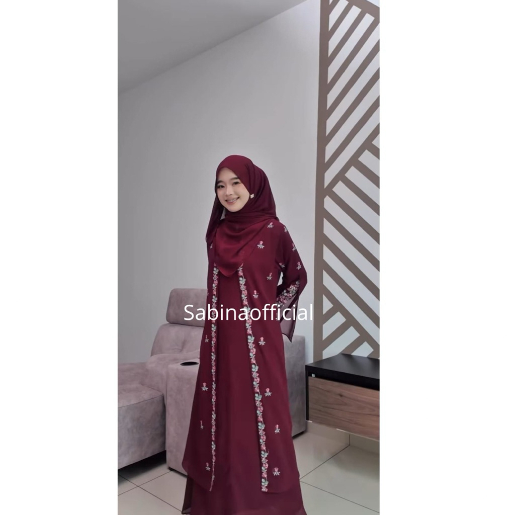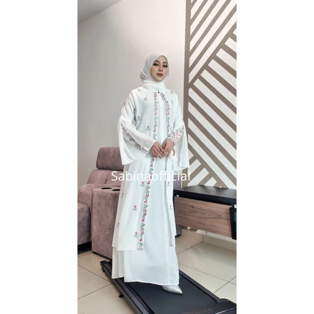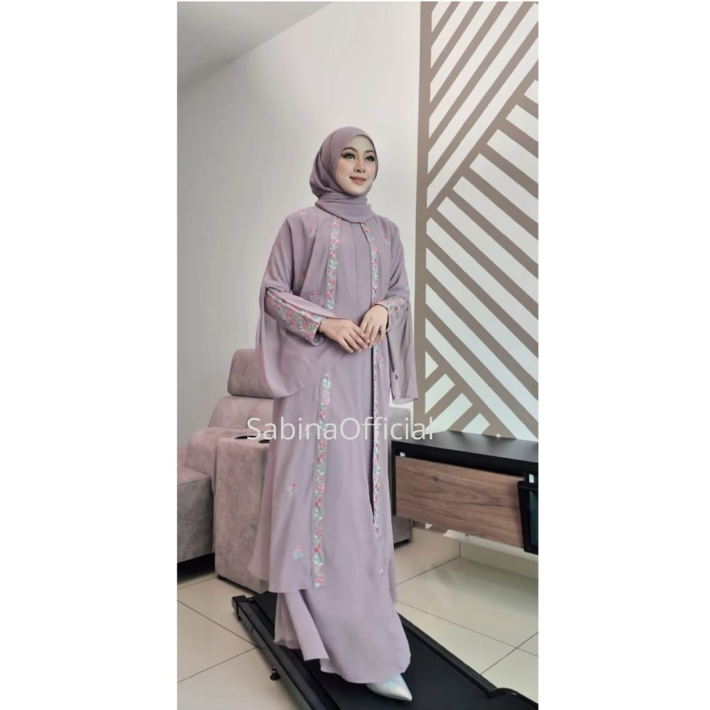 TRISHA ABAYA TWO LAYER EMBROIDERY APPLICATION CERUTY BABYDOLL MATERIAL FULL FRONT ZIPPER LINING BUSUI FRIENDLY