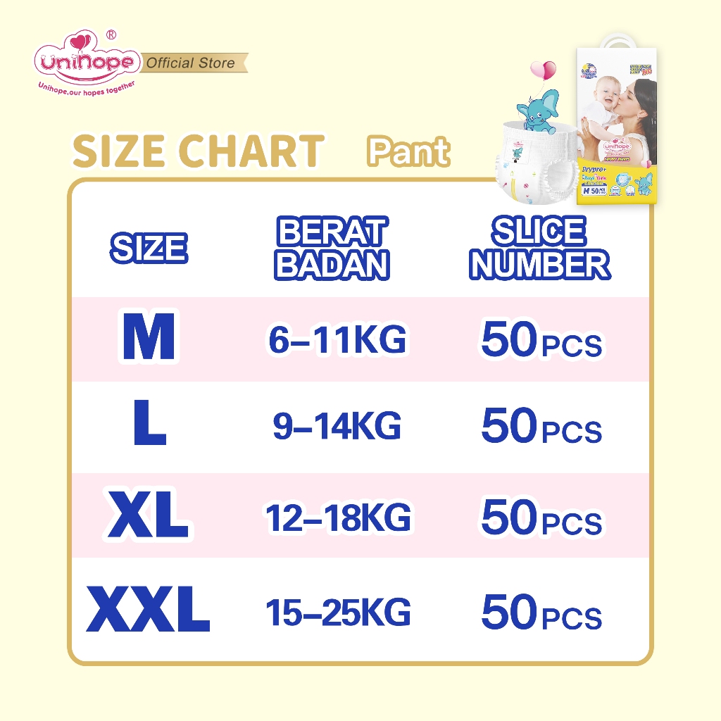 Unihope Dry Pro + Baby Diapers Pants Premium Natural Cottons - M 50/L 50/XL 50/XXL 50 (1 Packs)