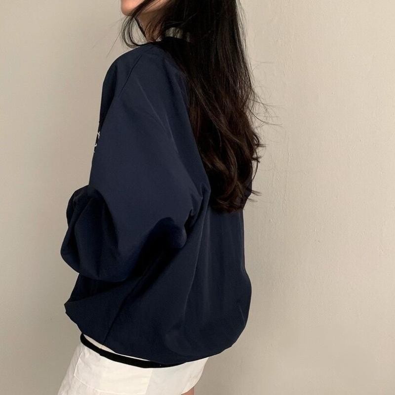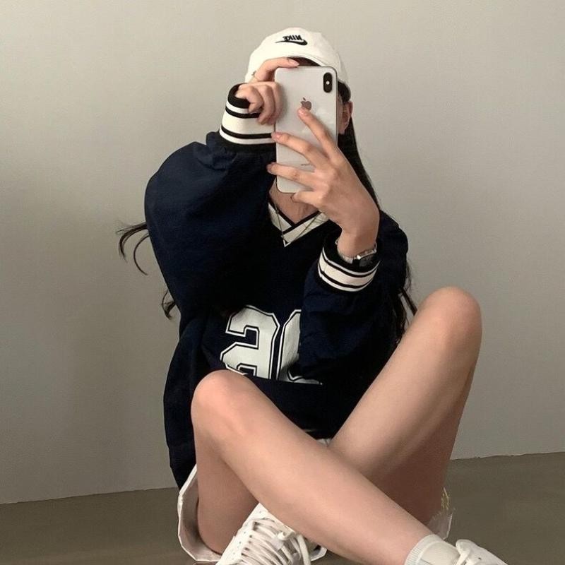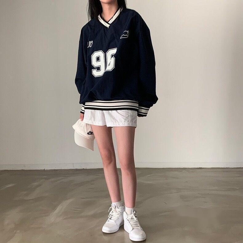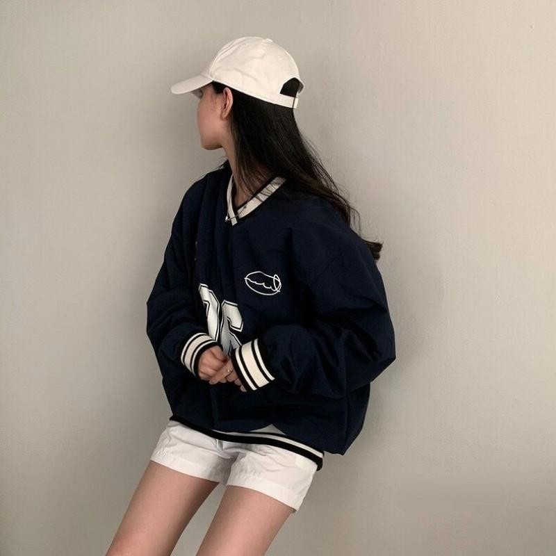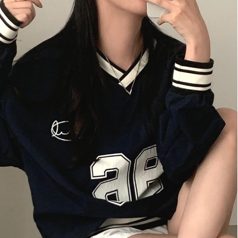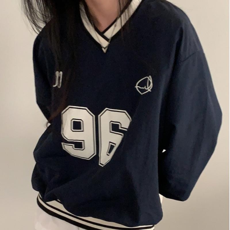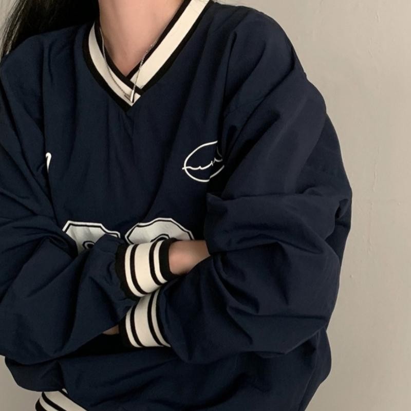 VELIN M-2XL Women Korean V Neck Long Sleeve Top Letter Printed Oversized Pullover Sweatshirt