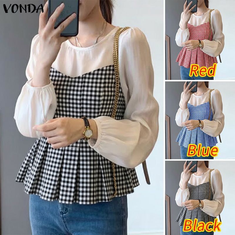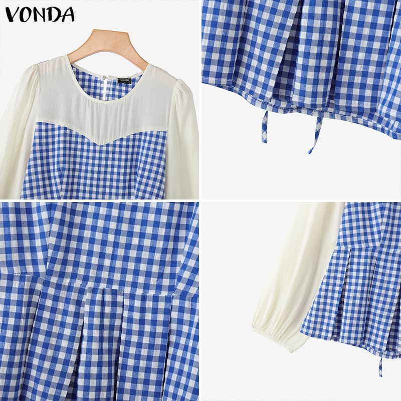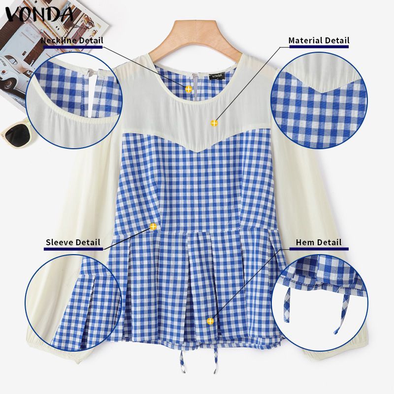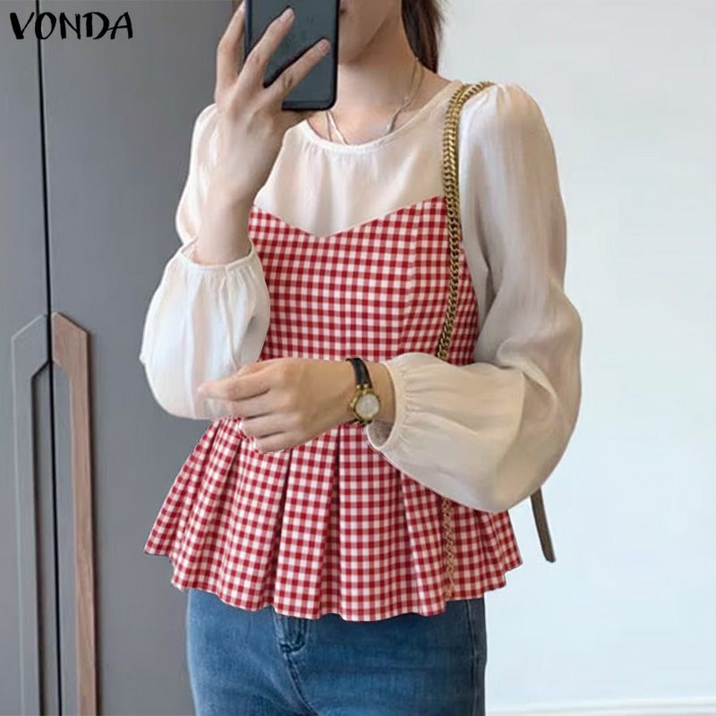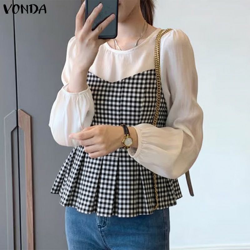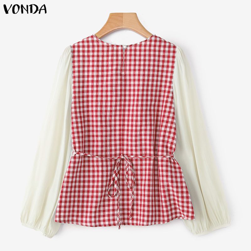 VONDA Women's Casual Checkered Blouse - Round Neck, Long Sleeves