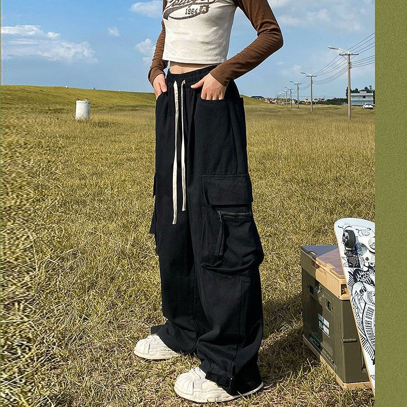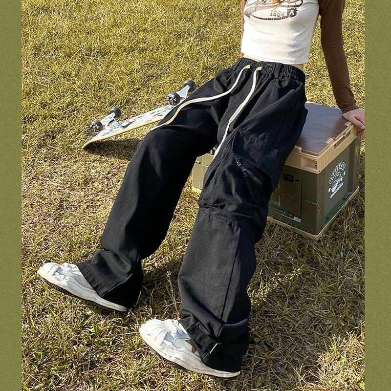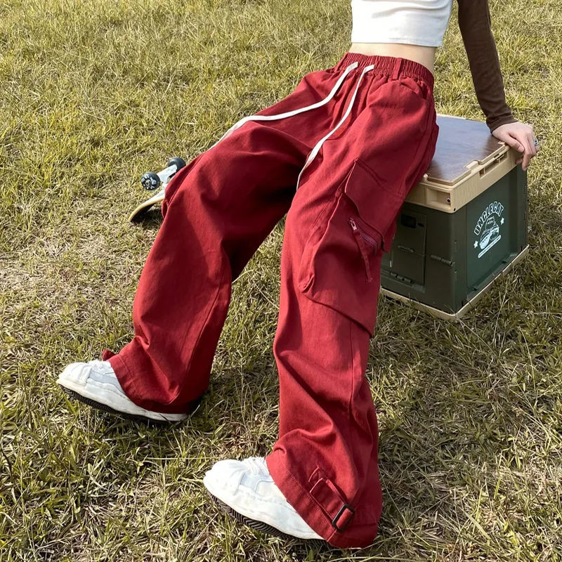 美式复古高街校园阔腿大码裤子红色宽松工装裤男女直筒休闲长裤Wide Leg Pants Loose Long Cargo Pants Women Pants Many Pockets
