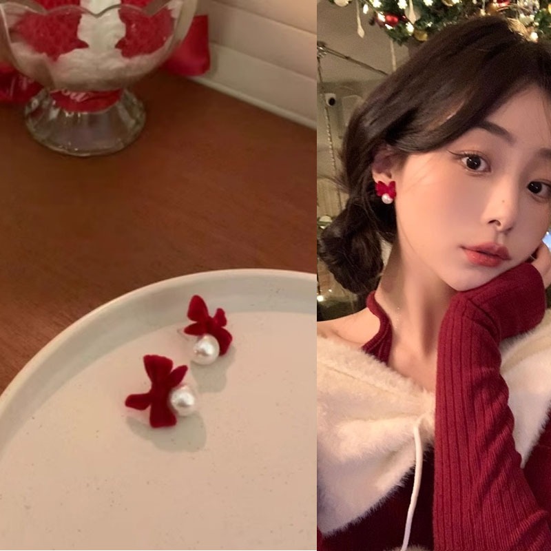 Wine Red Pearl Rose Flower Earrings Retro Wedding Ear Studs Chinese New Year Jewelry Earring